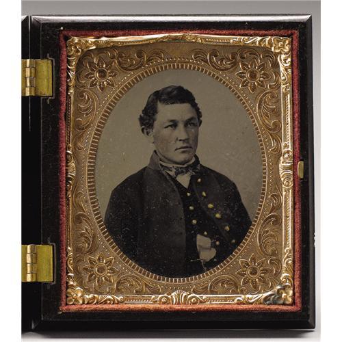 <B>Cased Pair of Union Soldier 1/6th Plate Tintypes. </B></I> Two uniformed subjects, likely brothers, had their portraits placed together in a double gutta-percha case molded with a stag on both sides. One fellow wears a cavalryman's shell jacket and has a forage cap having stamped brass crossed sabers on its crown. The other portrait shows the head and shoulders of a slightly older youth clothed in what appears to be an officer's coat and vest. The uniform, however, lacks insignia. Overall very fine condition.<BR><BR><b>Shipping:</b> Miscellaneous Collectibles, Smal (<a target="_blank" href="http://www.heritageauctions.com/common/shipping.php">view shipping information</a>)