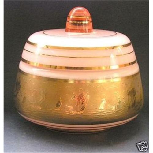 <tr><td>Title:Cased Pink Czech Glass Gold Overlay Powder Jar </td></tr>