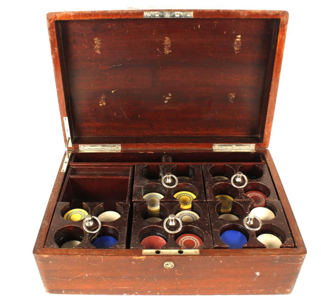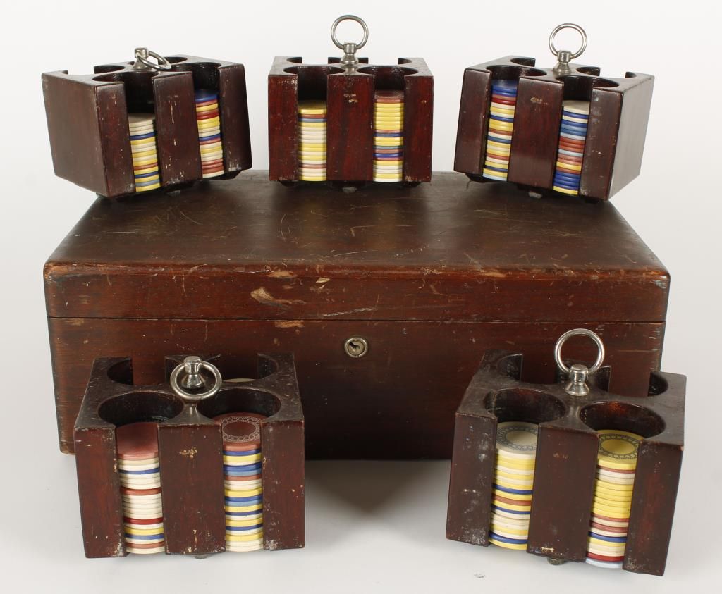 Circa 1930's era. Some chips are constructed of clay, others are pressed material. Case is solid mahogany, very well made. Locking mechanism intact but NO KEY. Case shows signs of use with dings and scratches.