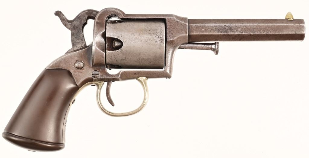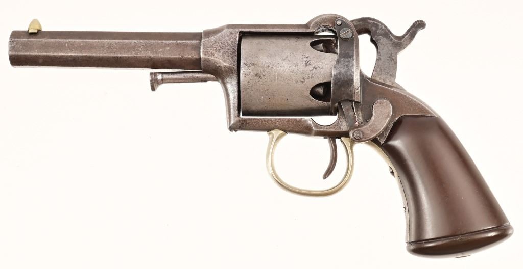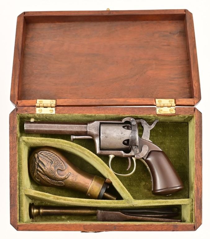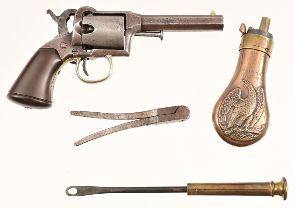 S/N 84. With 3" octagon barrel, 5-shot .31 caliber. Only 4500-5000 of these rare firearms being manufactured from 1857-1858 this early serial number 84 is truly a rare find. Wood presentation case with Colt patent powder flask.