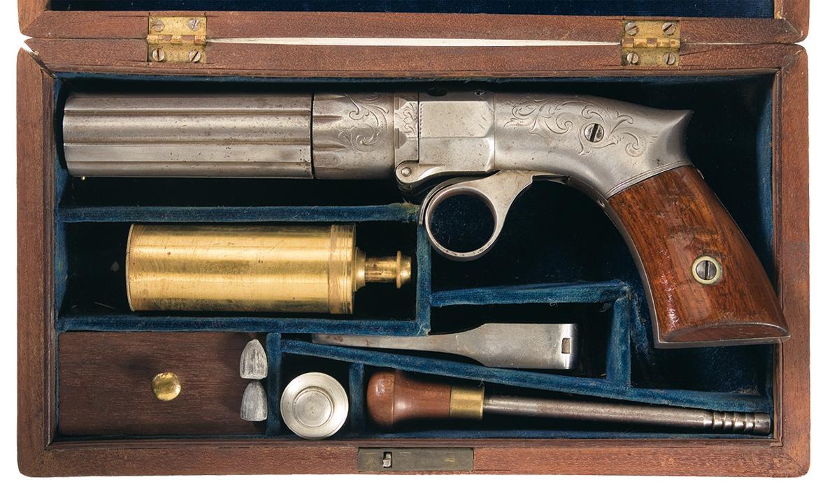 Approximately 7,000 of these Pepperboxes were manufactured from 1851 to 1854 and were an improved version of the George Leonard Jr. patent. Marked "ROBBINS & LAWRENCE CO", "WINDSOR.VT" and "PATENT. 1849." on three adjacent barrel ribs. The serial number is marked on the butt, left side of the frame under the grip and on the inside of each grip panel, with the partial number "54" marked on the face of the breech. This pistol is fitted with the 3 1/4" five shot barrel cluster that unscrews to load and the breech section tips down for capping. Standard broad scroll engraving on the breech end of the barrels, frame and fitted with smooth two piece walnut grips. Complete in a walnut case with blue lining, a brass charger, oiler, two cavity bullet mold, about 15 caps and a wooden handled cleaning rod.