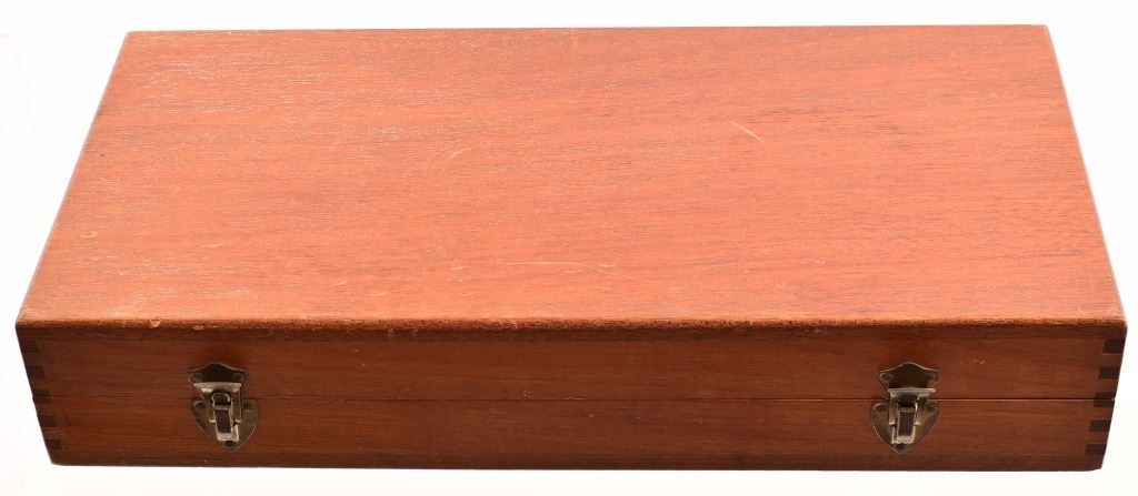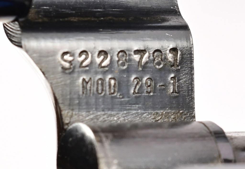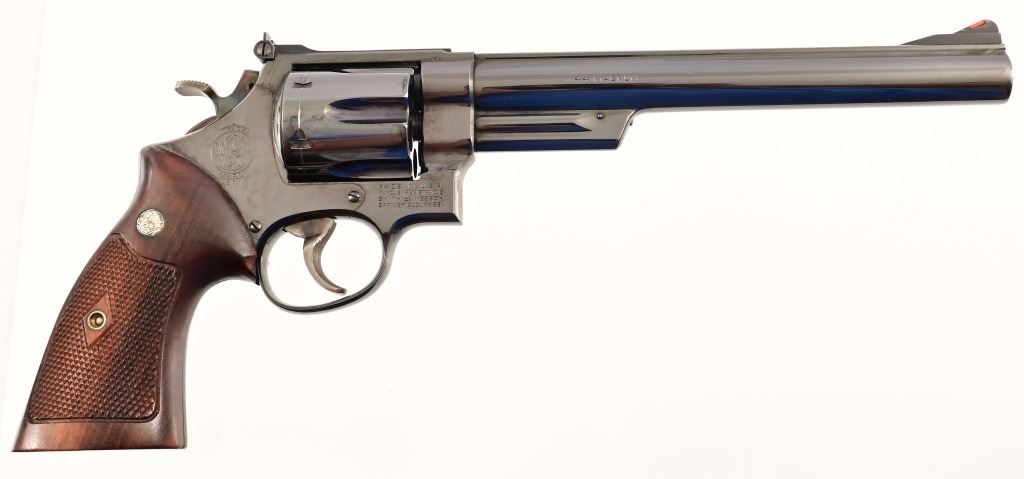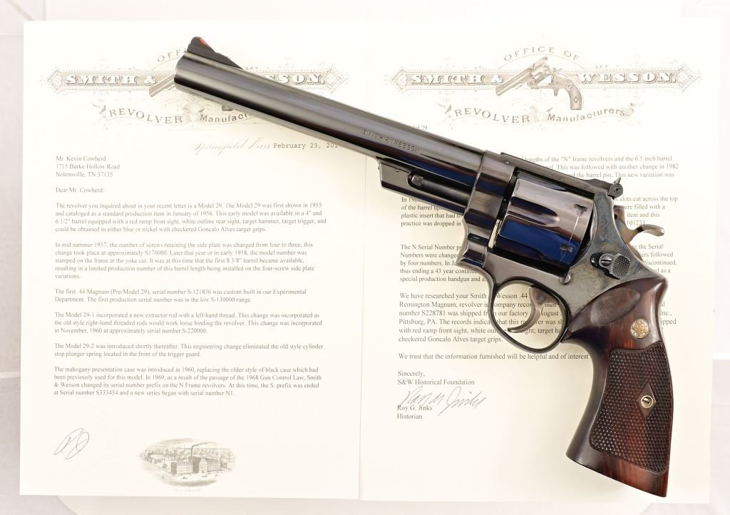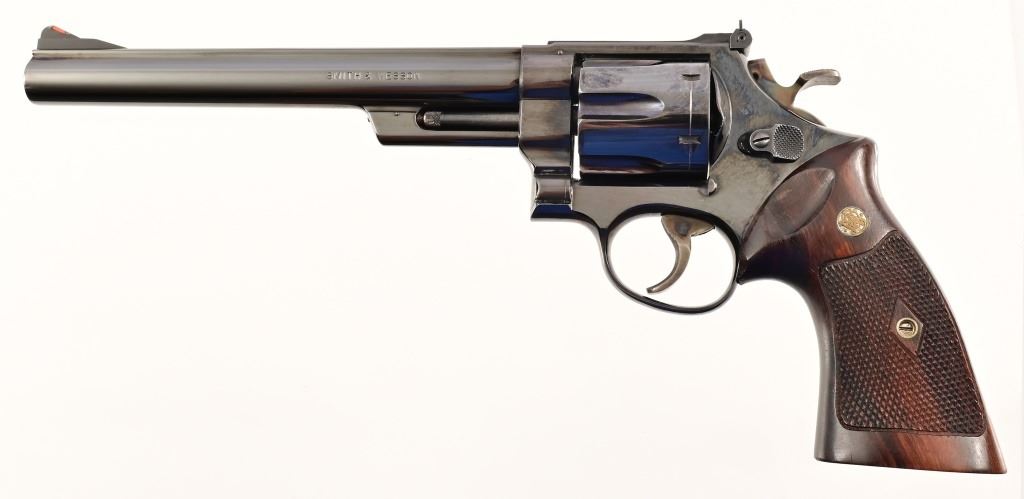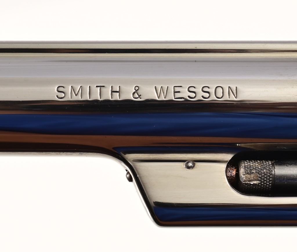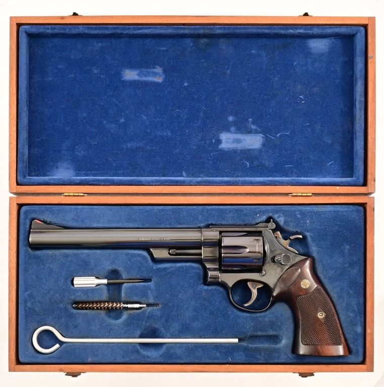 8.375" barrel, blue finish, checkered wood grips. Target hammer, trigger, and sights. Serial S228781, in excellent condition with wood presentation case. Factory S&W Roy G. Jinks letter.