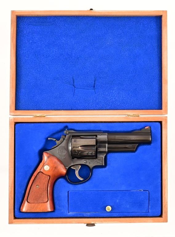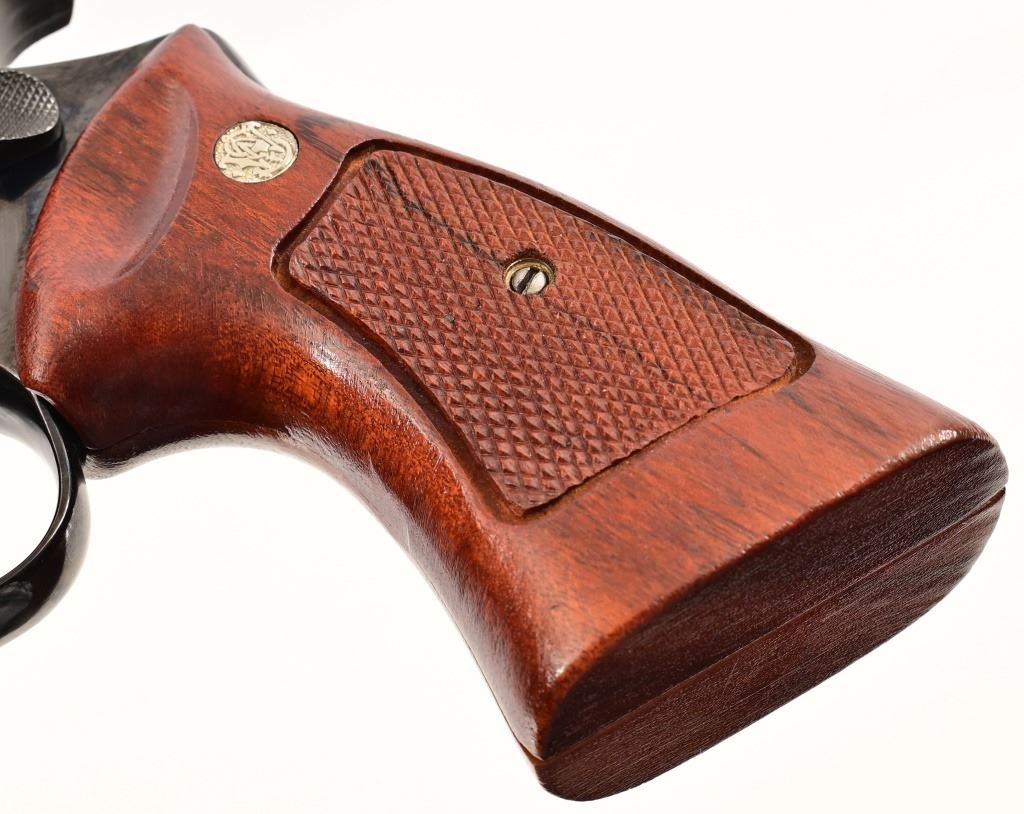 4" pinned barrel, 4 screw frame, blue finish, checkered wood grips. Target hammer, trigger, and sights. Serial N789934 (1980) Excellent condition, with wood presentation box.