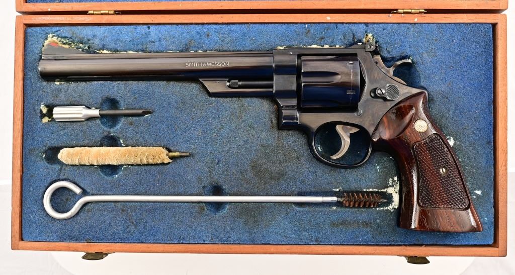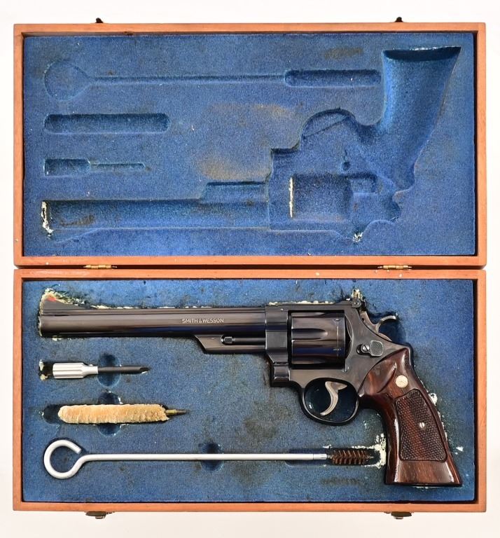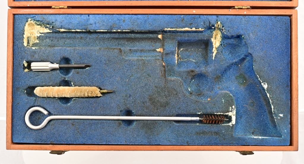 8.375" pinned Magnaport barrel, 3 screw frame, blue finish with checkered wood grips. Target hammer, trigger, and sights. Serial N415564, in excellent condition with wood presentation case(does need re-flocking)