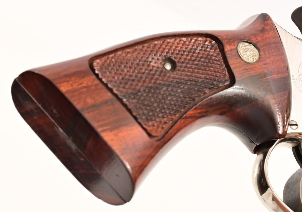 Nickel plated, 8.375" pinned barrel, nice checkered wood grips. Target hammer, trigger, sights. Serial N621290, excellent condition with wood presentation case and shipment box.