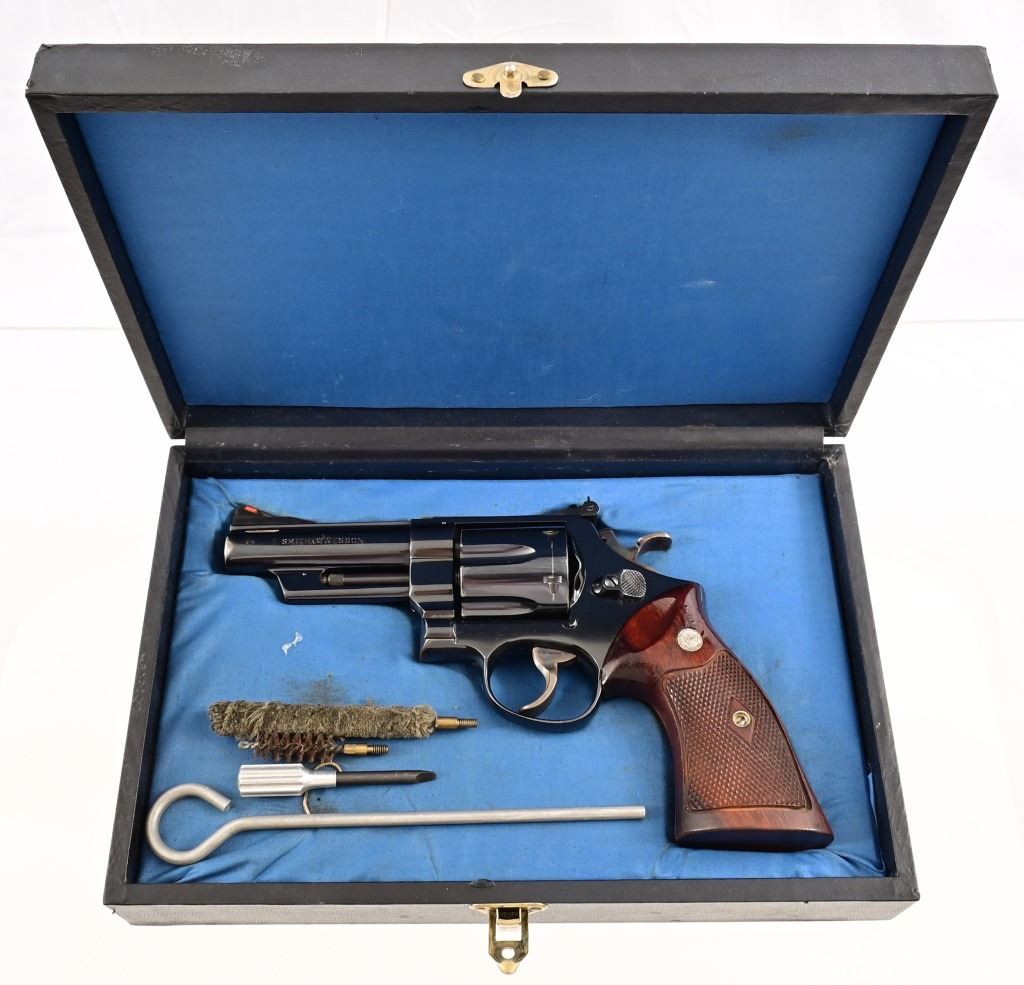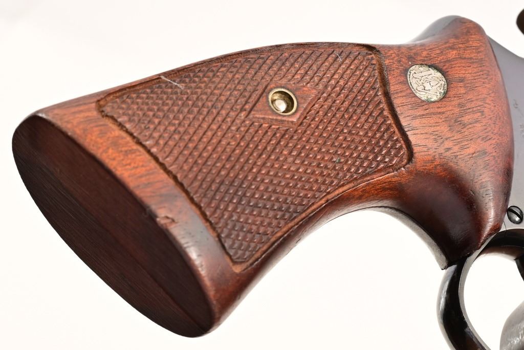 4" pinned Magnaport barrel, 4 screw frame, blue finish, with correct Coke bottle grips. Target hammer, trigger, and sights. Serial S187909 (1958), excellent 95%+ condition, with some discoloration at barrel end. Blue presentation case, with marked shipping box.