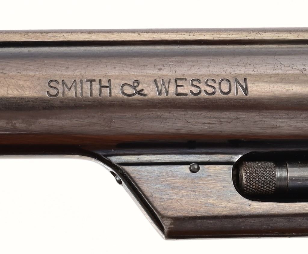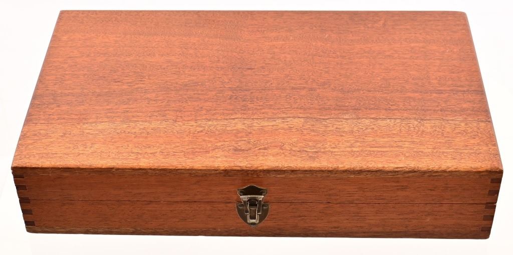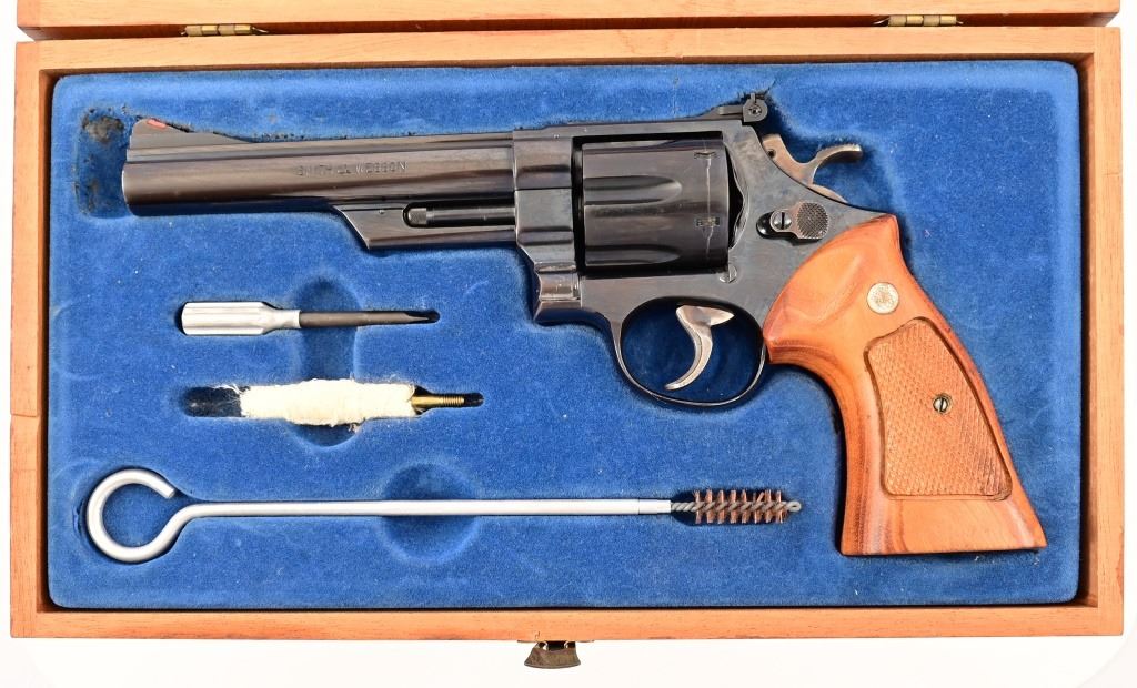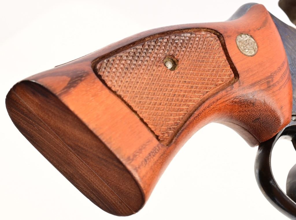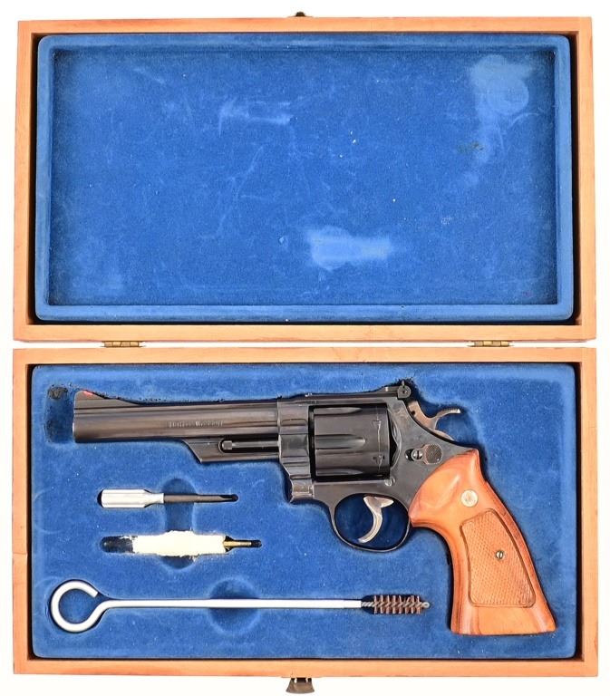 6" pinned barrel, 3 screw frame, blue finish, with checkered wood grips. Target hammer, trigger, and sights. Serial S318924 (1969-1970) in good condition, with wood presentation box.