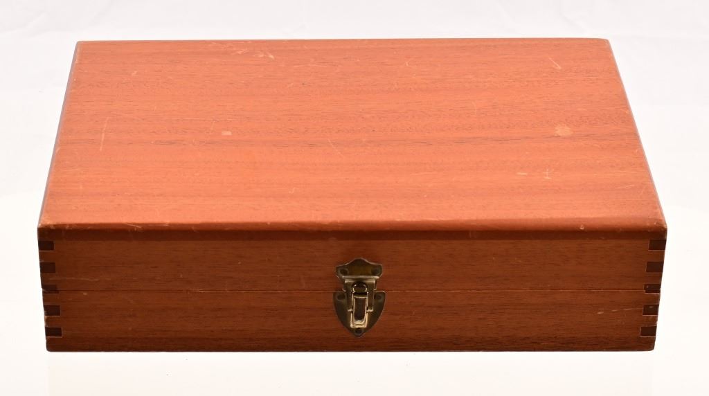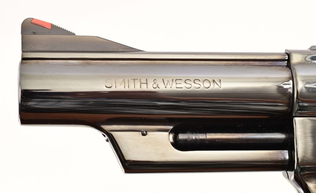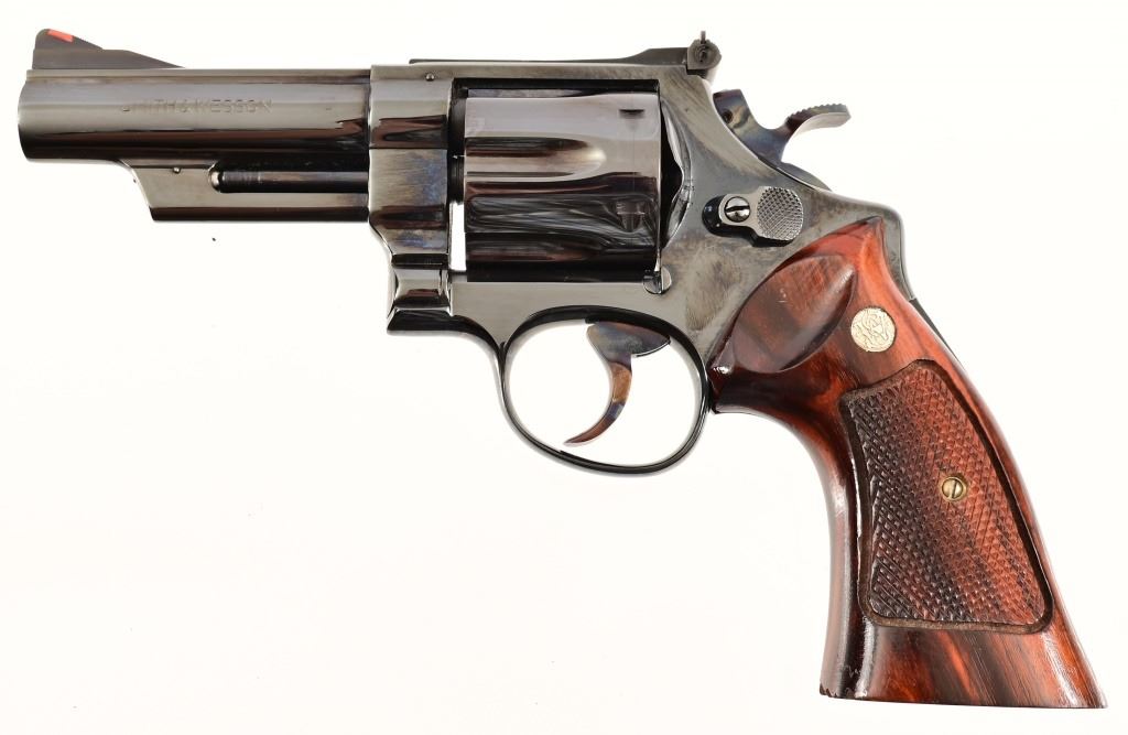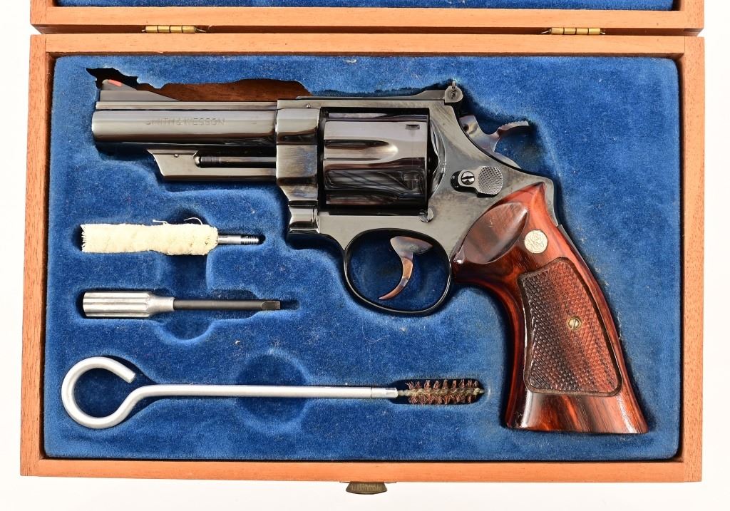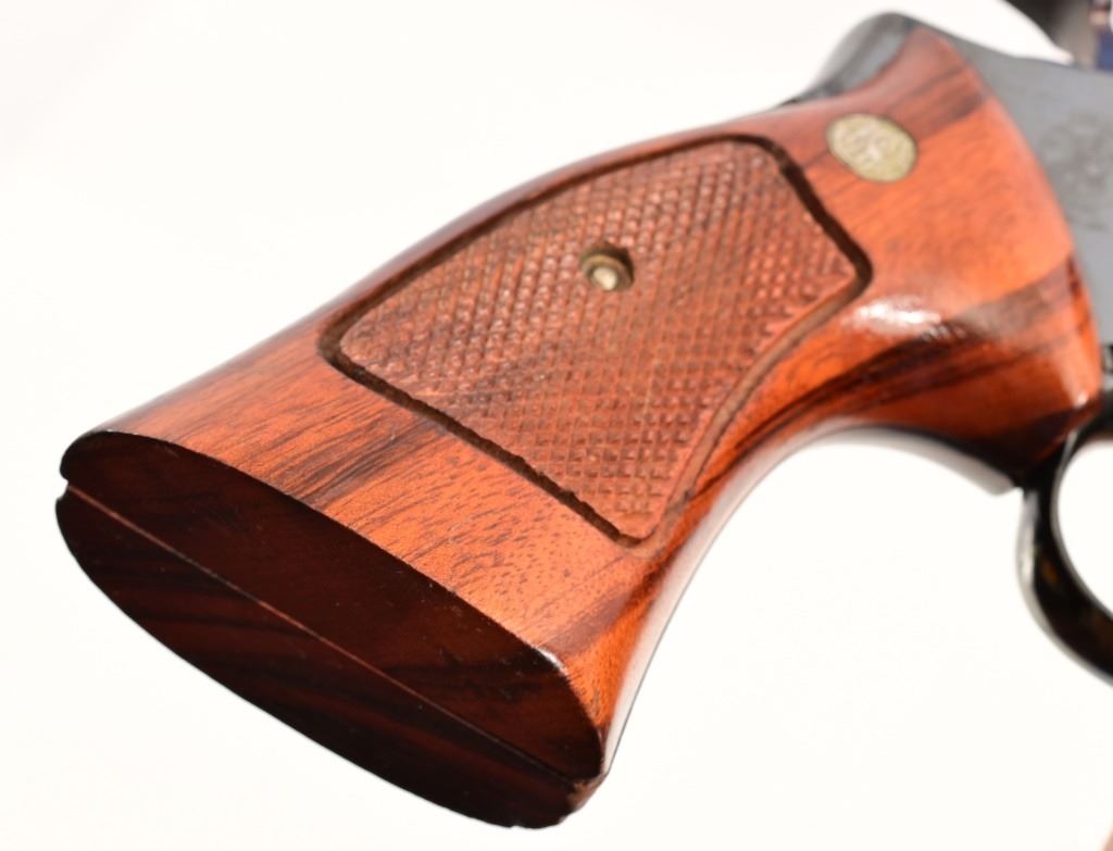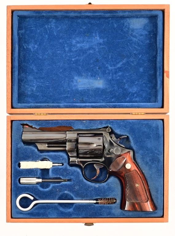 4" pinned barrel, blue finish, checkered wood grips. Target trigger, hammer, and sights. Serial N730753 in excellent condition, with wood presentation box.