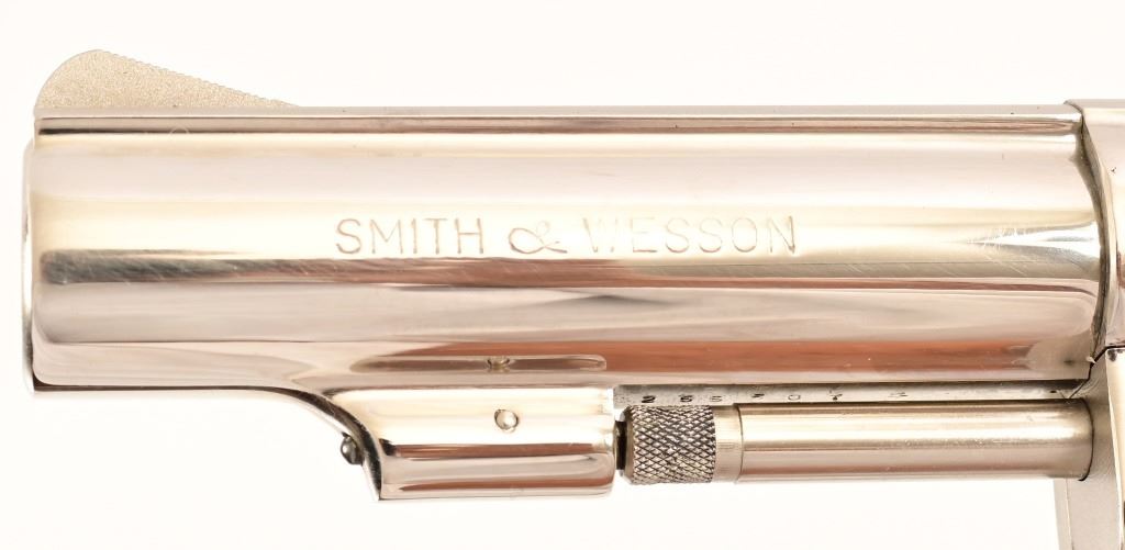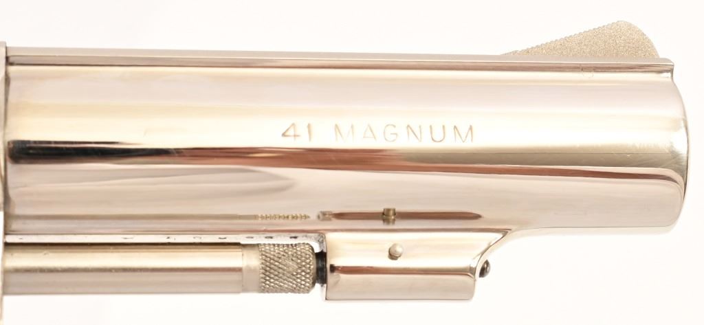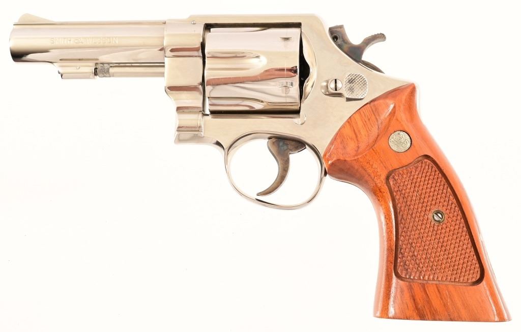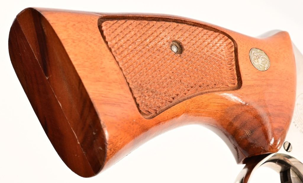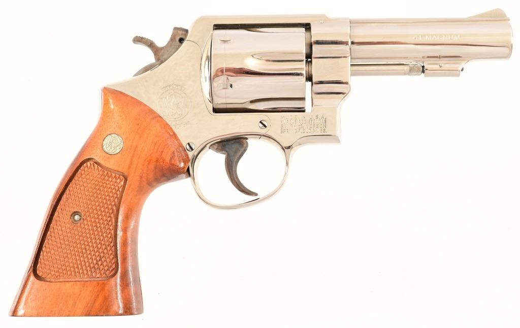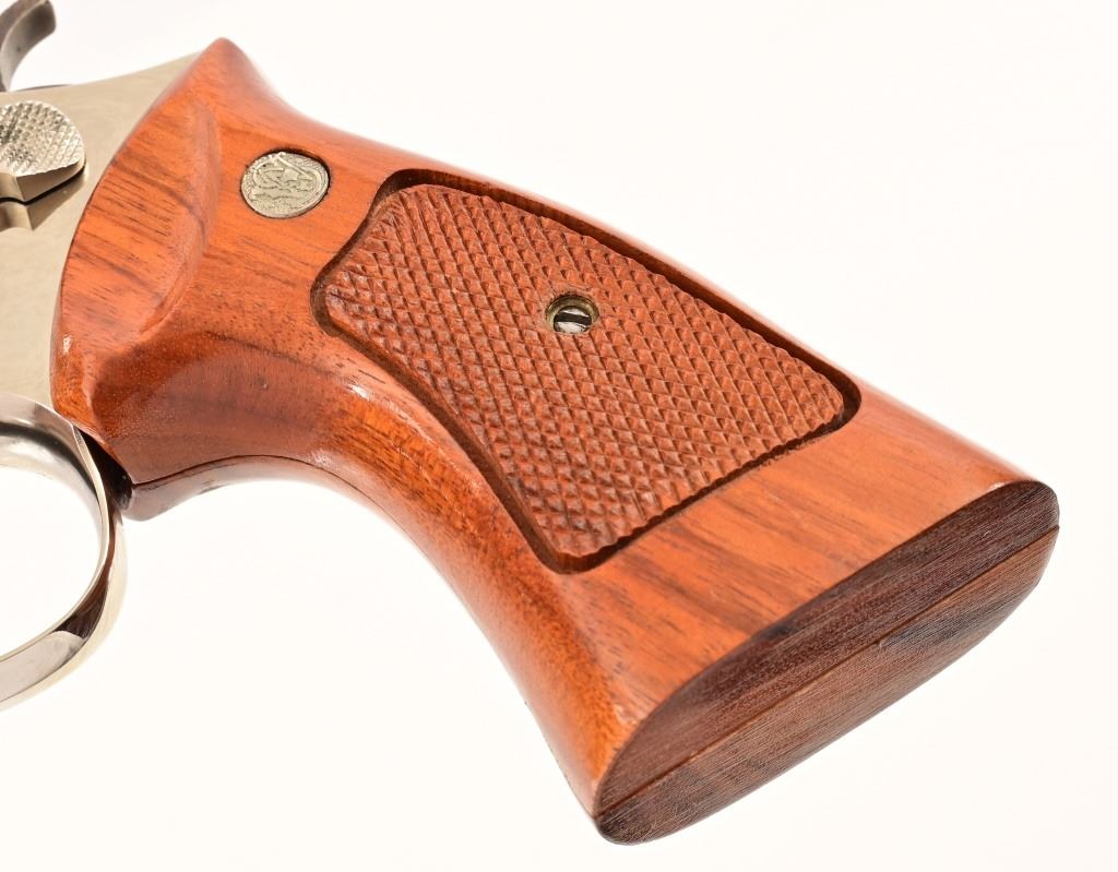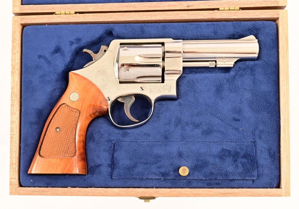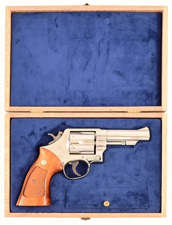 Rare factory nickel plated, 4" pinned barrel, square butt "N" frame. Standard hammer & trigger. Serial S256607 (1964 -65 Early Issue) Excellent condition with wood presentation box.