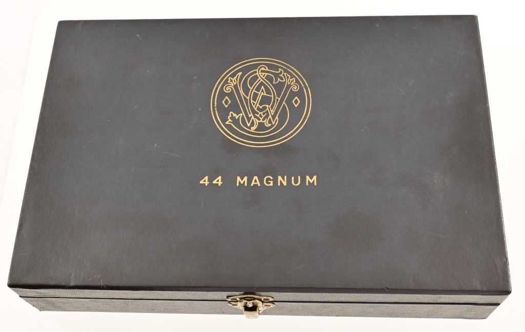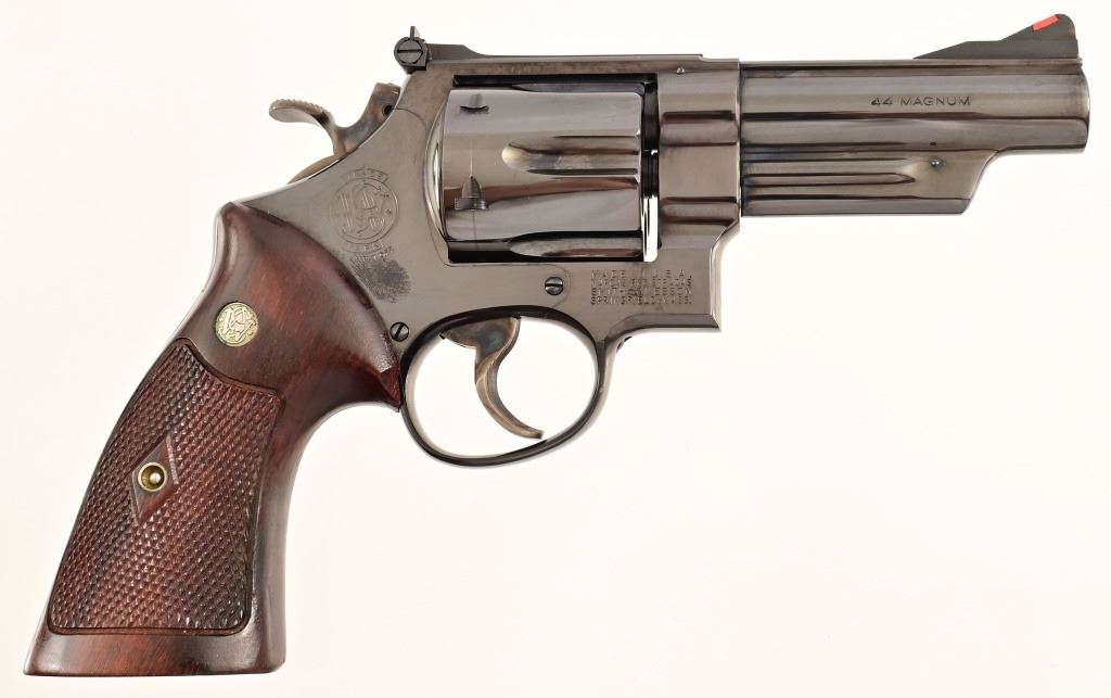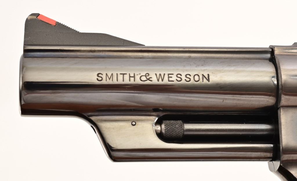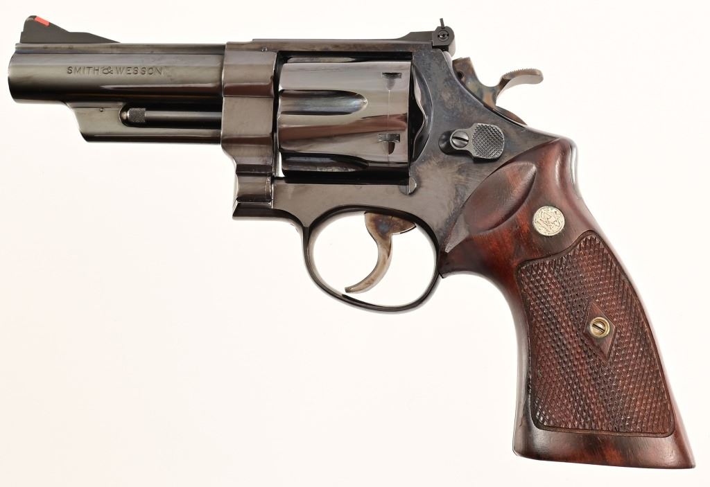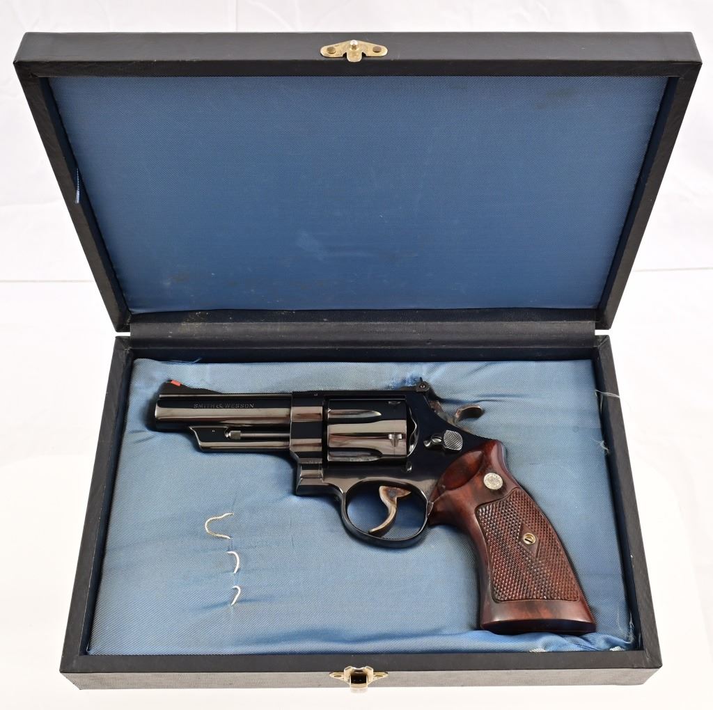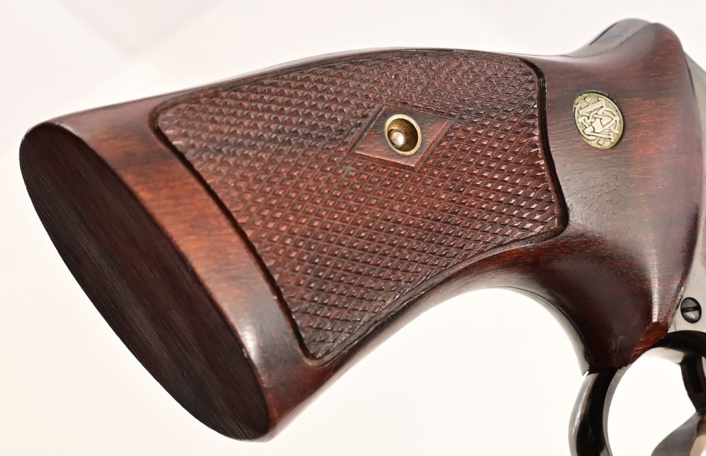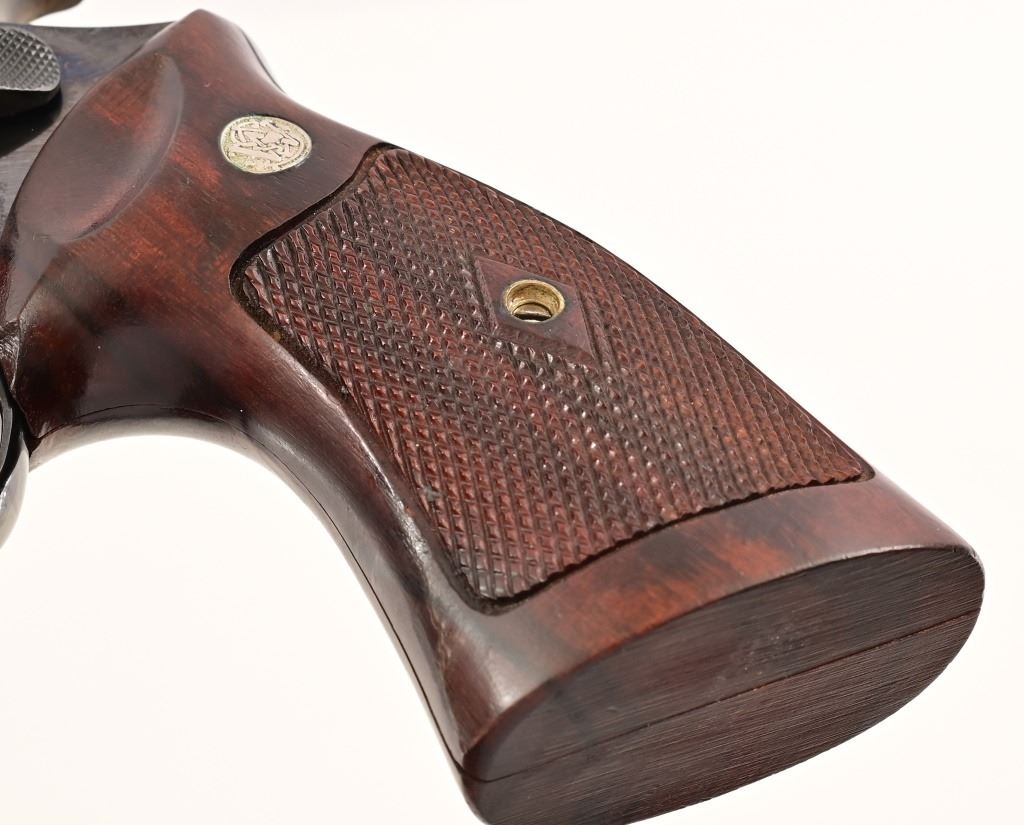 Rare 4" pinned barrel, 4 screw frame, blue finish, with checkered wood "Coke bottle" grips. Target hammer, trigger, and sights. Serial S179052 (1987), in fantastic condition, with correct dark blue pebble grain leatherette presentation case & tools.