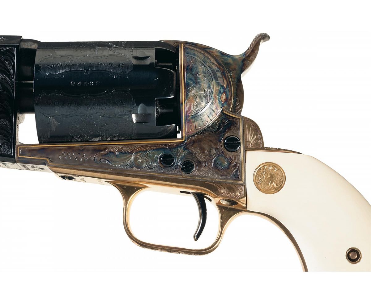 A) This limited edition set is number 26 of 50 manufactured. These revolvers have extremely well executed "C" coverage floral scroll engraving with a punch dot background. The engraving covers most of the barrel, barrel lug, frame, trigger guard bow, butt and back strap with the sides of the hammer engraved with the wolf's head design. There is a gold band inlaid at the muzzle and rear of the barrel, a gold wire inlaid border around the outside of the frame and "1 of 50" is inlaid in gold on the right side of the frame. Underneath the serial number of the trigger guard is stamped "SET No 26". Fitted with a set of smooth ivory grips with gold Colt medallions. The factory letter confirms the configuration, that it came with a two gun walnut display case and that it shipped to Jerry Berman and Sons on May, 24th, 1979 with the "B" gun. With the walnut Colt two gun display case mentioned in the letter, the original box numbered to gun, an engraved nipple wrench/screwdriver, a powder flask, a bullet mold and an empty cap tin.
