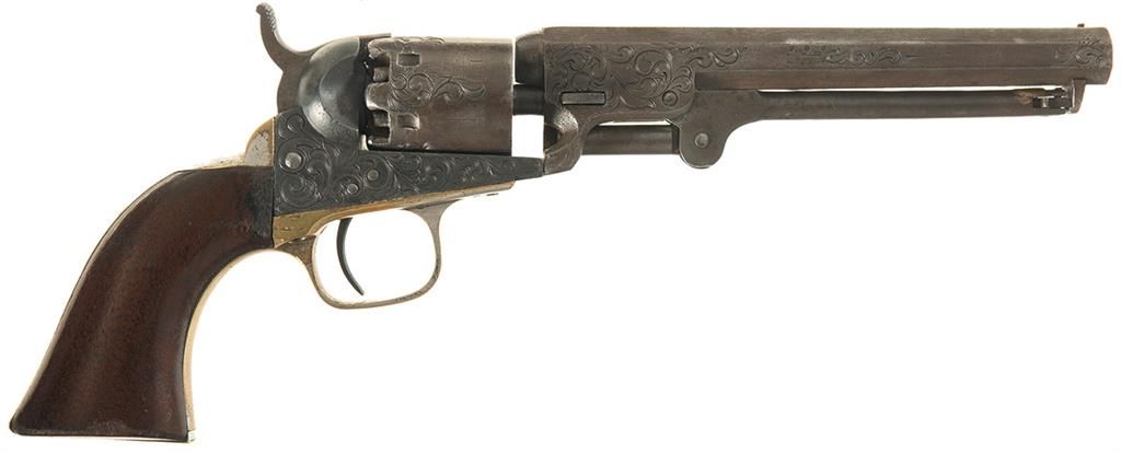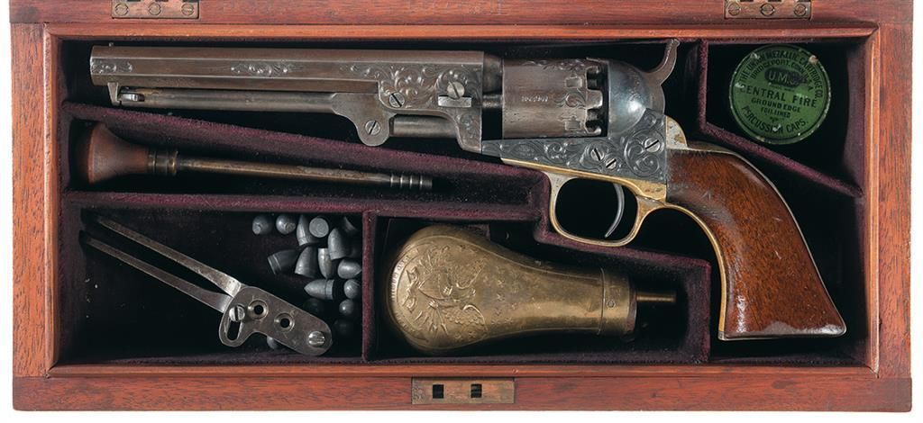 Manufactured in 1862 and subsequently engraved by William B. Ellis. Floral scroll engraving on the cylinder, frame and barrel, and signed "W.B.ellis" on the barrel lug. In a Breakwelt wooden case with a partially full UMC cap tin, eagle flask, cleaning rod, sealed reproduction box of 6 combustible envelope cartridges, two cavity iron bullet mold and approximately 19 round and conical lead bullets.