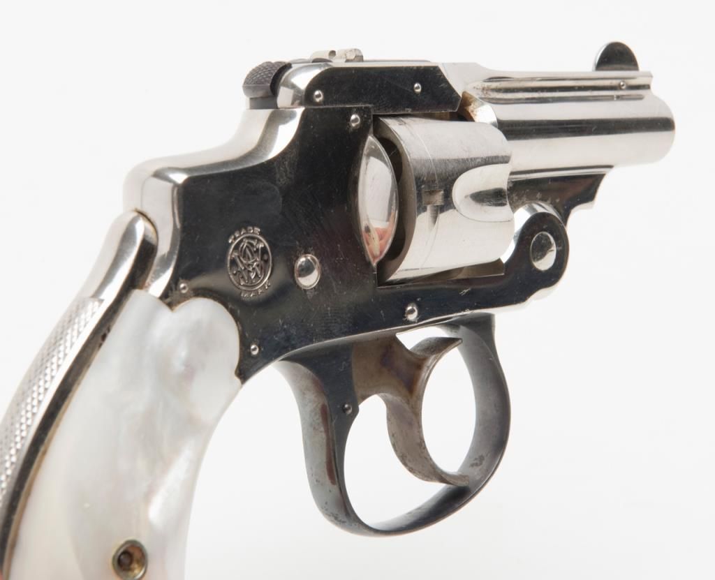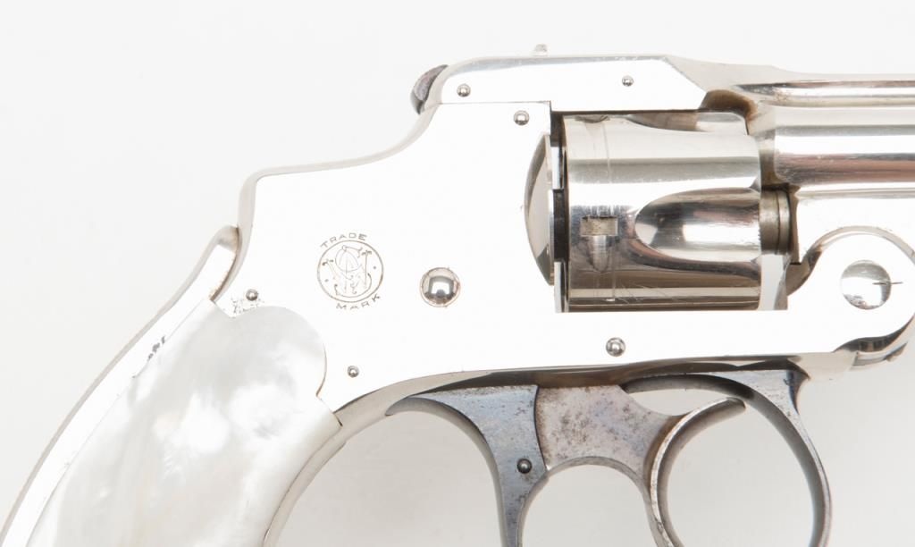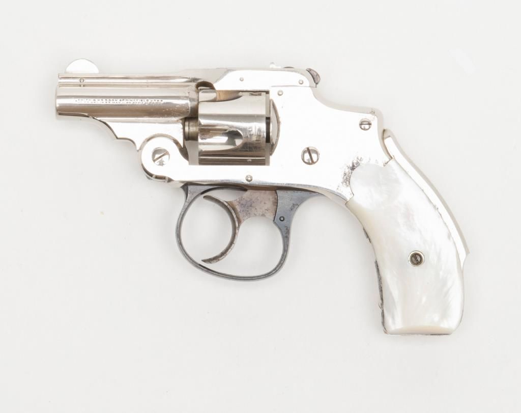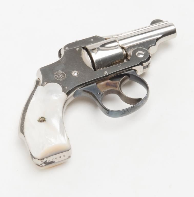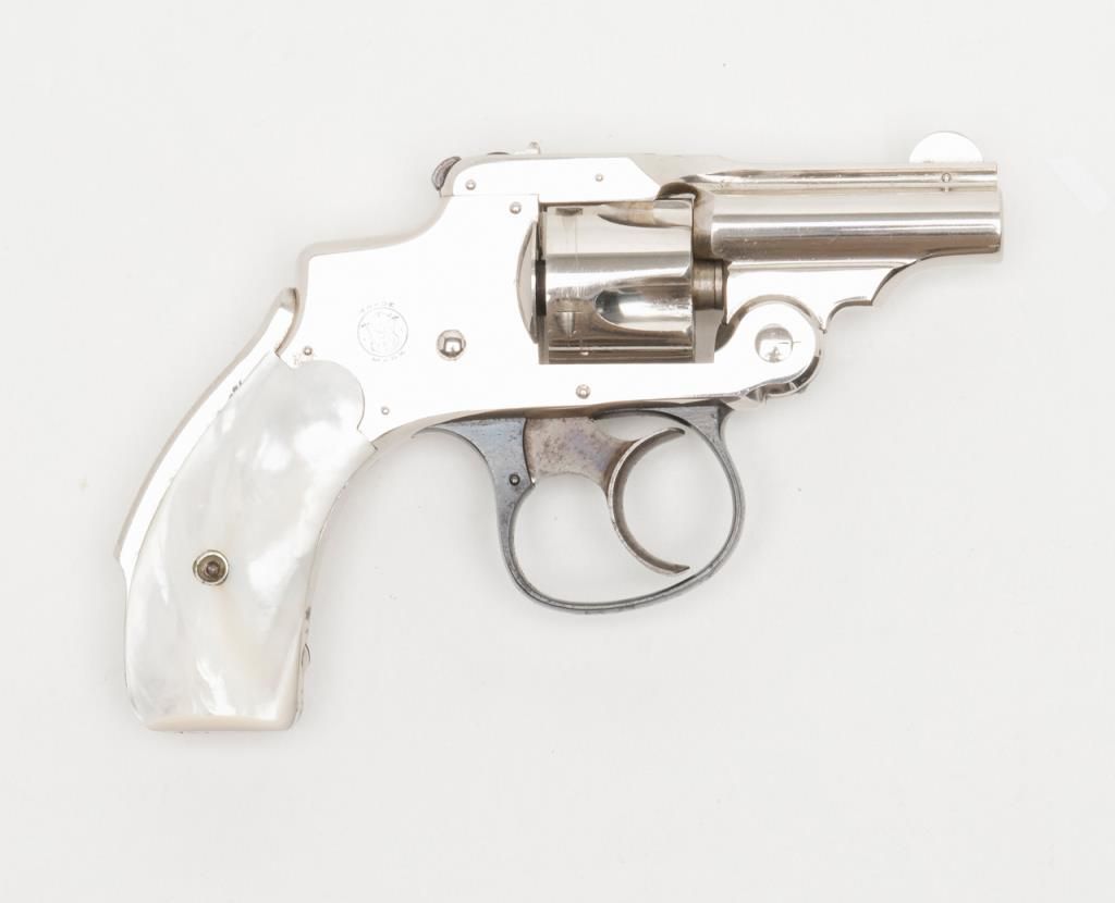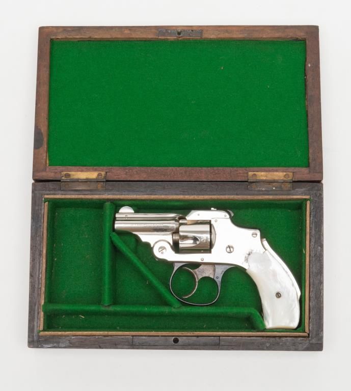 Cased Smith & Wesson .32 Safety Hammerless “Bicycle” Model DA revolver, 2” barrel, nickel finish, pearl grips, #87798 in overall fine condition showing approx. 95%+ original finish with losses confined primarily to spots around the grips where the finish has flaked; the gun shows little firing as the interior is crisp, bore is fine, action crisp, markings sharp, case color vivid on the trigger with bright blue on the trigger guard; iridescent pearl grips are fineoverall and fit beautifully; the wood casing with this gun is of English style and overall good with key escutcheon missing and interior re-lined. Accompanying the piece is a 1992 dated letter on Cheshire Constabulary letterhead to noted S & Wcollector, Dr. John Hall from David F. Astbury, referencing this revolver by serial number as being from the estate of Lady Mary Grosvenor, Aunt to the Duke of Westminster, who likely carried this gun in her travels abroad prior to WW II forprotection. Astbury further notes that the Grosvenor family was “amonst” the most wealthy and influential people in the United Kingdom owning considerable property including the U.S. Embassy in Grosvenor Square, London. Astbury also states