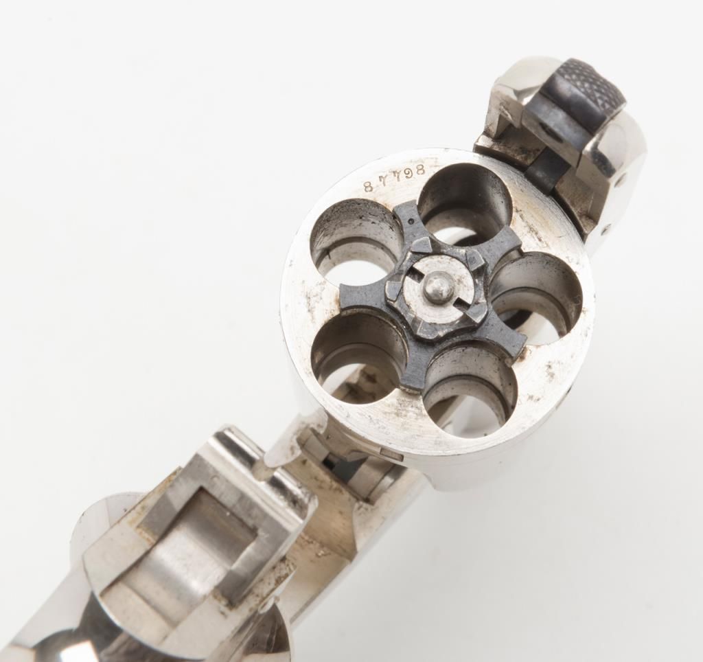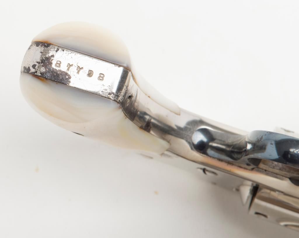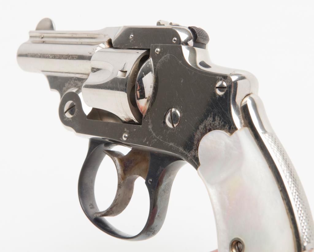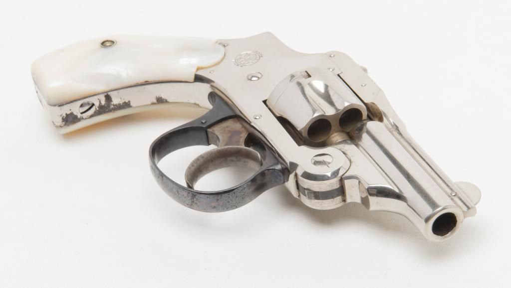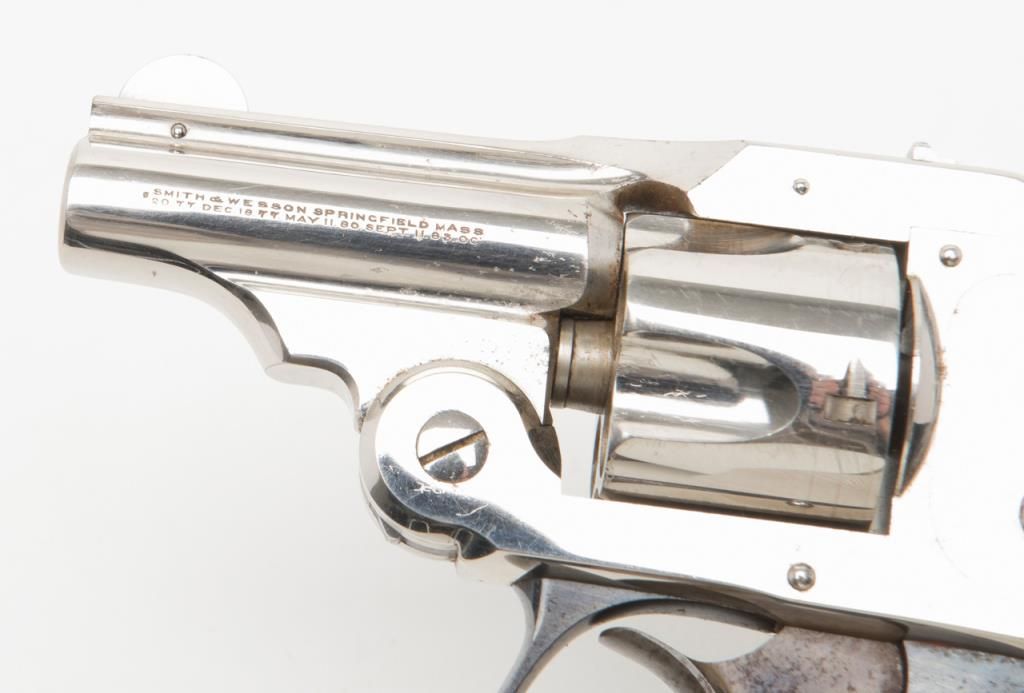 Cased Smith & Wesson .32 Safety Hammerless “Bicycle” Model DA revolver, 2” barrel, nickel finish, pearl grips, #87798 in overall fine condition showing approx. 95%+ original finish with losses confined primarily to spots around the grips where the finish has flaked; the gun shows little firing as the interior is crisp, bore is fine, action crisp, markings sharp, case color vivid on the trigger with bright blue on the trigger guard; iridescent pearl grips are fineoverall and fit beautifully; the wood casing with this gun is of English style and overall good with key escutcheon missing and interior re-lined. Accompanying the piece is a 1992 dated letter on Cheshire Constabulary letterhead to noted S & Wcollector, Dr. John Hall from David F. Astbury, referencing this revolver by serial number as being from the estate of Lady Mary Grosvenor, Aunt to the Duke of Westminster, who likely carried this gun in her travels abroad prior to WW II forprotection. Astbury further notes that the Grosvenor family was “amonst” the most wealthy and influential people in the United Kingdom owning considerable property including the U.S. Embassy in Grosvenor Square, London. Astbury also states
