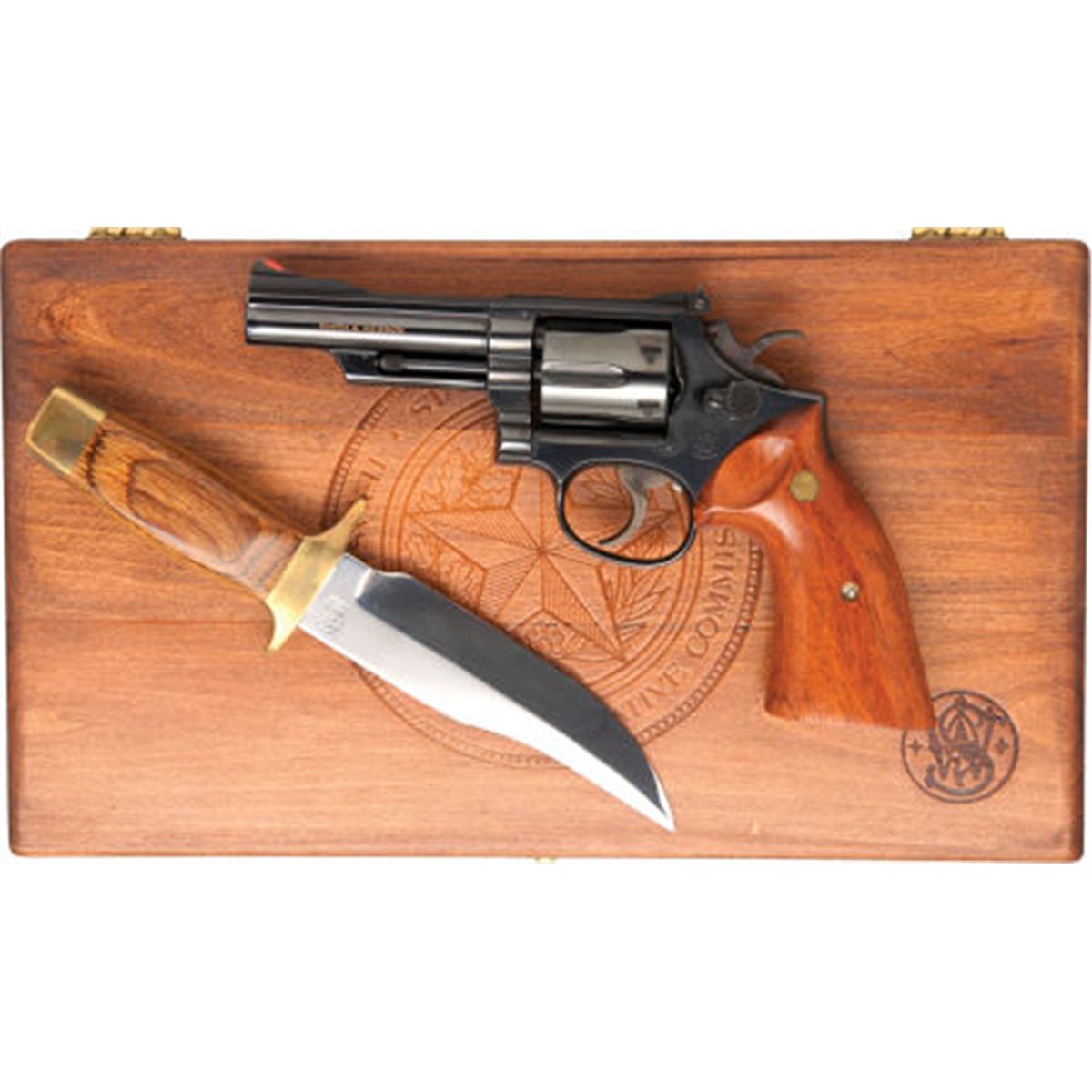 **Cased Smith & Wesson Model 19-3 Commemorative Texas Ranger Revolver and Bowie Knife Ensemble. Serial no. TR8406, .357 magnum, 4-inch barrel with target sights. Texas Ranger logo on right side of frame in gold. Blued finish. Case-hardened hammer and trigger. Triggerguard rebated on right side. Varnished mahogany grips with medallions. Contained in original mahogany factory case together with accompanying commemorative Texas Ranger bowie knife with Smith & Wesson logo. Sold together with original factory blue box for knife containing leather scabbard. Condition: Excellent with slight storage and handling wear in evidence. Knife excellent to mint. Case and box excellent.