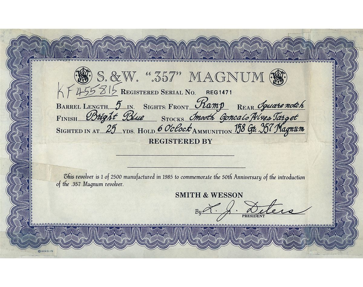 One of 2,500 manufactured in 1985, standard markings and features. With correct hardwood case lined in blue velvet and certificate numbered to gun.