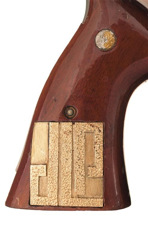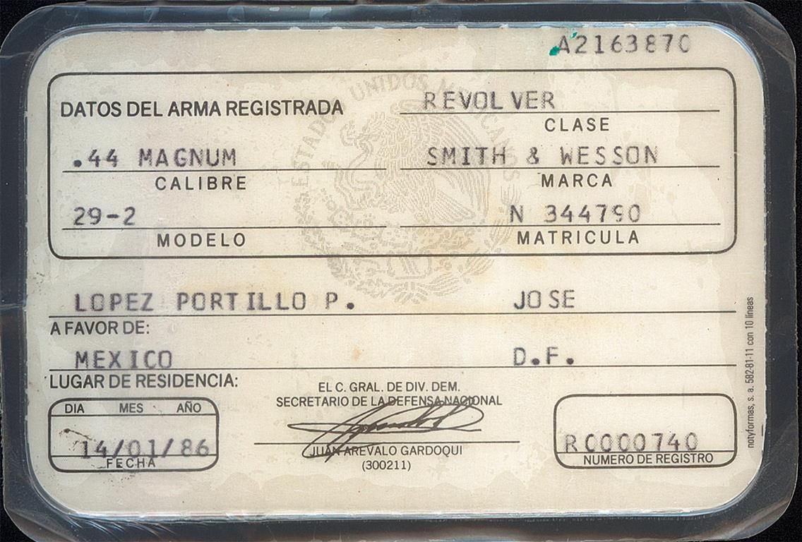 Manufactured between 1975 and 1976. Red insert ramp front sight and a white outlined adjustable rear sight, casehardened, lightly jeweled narrow skeletonized hammer, casehardened trigger and ported barrel. Fitted with smooth goncalo alves grips with silver S&W medallions. The grips also feature a gold Mexican eagle insert in the left panel and a gold insert with the initials "JLP" in the right panel. The revolver has the standard markings of the model 29. Complete with a wood display case with a plaque on the lid marked "Jose Lopez Portillo/Presidente de Mexico". Also included is a brief biography of President Portillo and a certificate of firearms registration that confirms the manufacture, model and serial number and that it was registered to Jose Lopez Portillo.