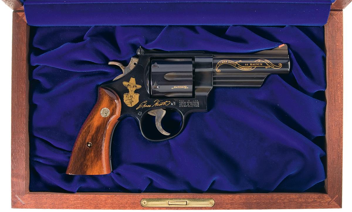 This limited edition of 2,500 revolvers commemorates Elmer Keith. The right side of the barrel is marked with gold etched commemorative banner, the cylinder is gold etched, "1st OUTSTANDING / HANDGUNNER", "SALMON / IDAHO", "HELL I WAS / THERE" and "SIXGUNS". Gold etched "SMITH & WESSON / 44 Magnum" with decorative border on the left side of the barrel and gold "1 OF 2,500" on the left frame. All blue finish with casehardened hammer and trigger and fitted with smooth two piece varnished walnut grips with S&W medallions. Complete with a commemorative presentation case with brass lid plaque and blue lining. Also comes with the original Smith & Wesson box and shipping box.