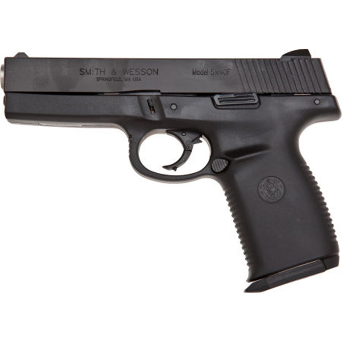 Cased Smith & Wesson Model SW40F Semi-Automatic Pistol. Serial no. PAE5264, .40 S & W caliber, 4 1/2-inch barrel. Black finish. Black plastic grip assembly. Contained in original blue plastic travel case, together with extra magazine and instruction manual. Condition: Excellent. NRA FIREARMS FOR FREEDOM PROGRAM