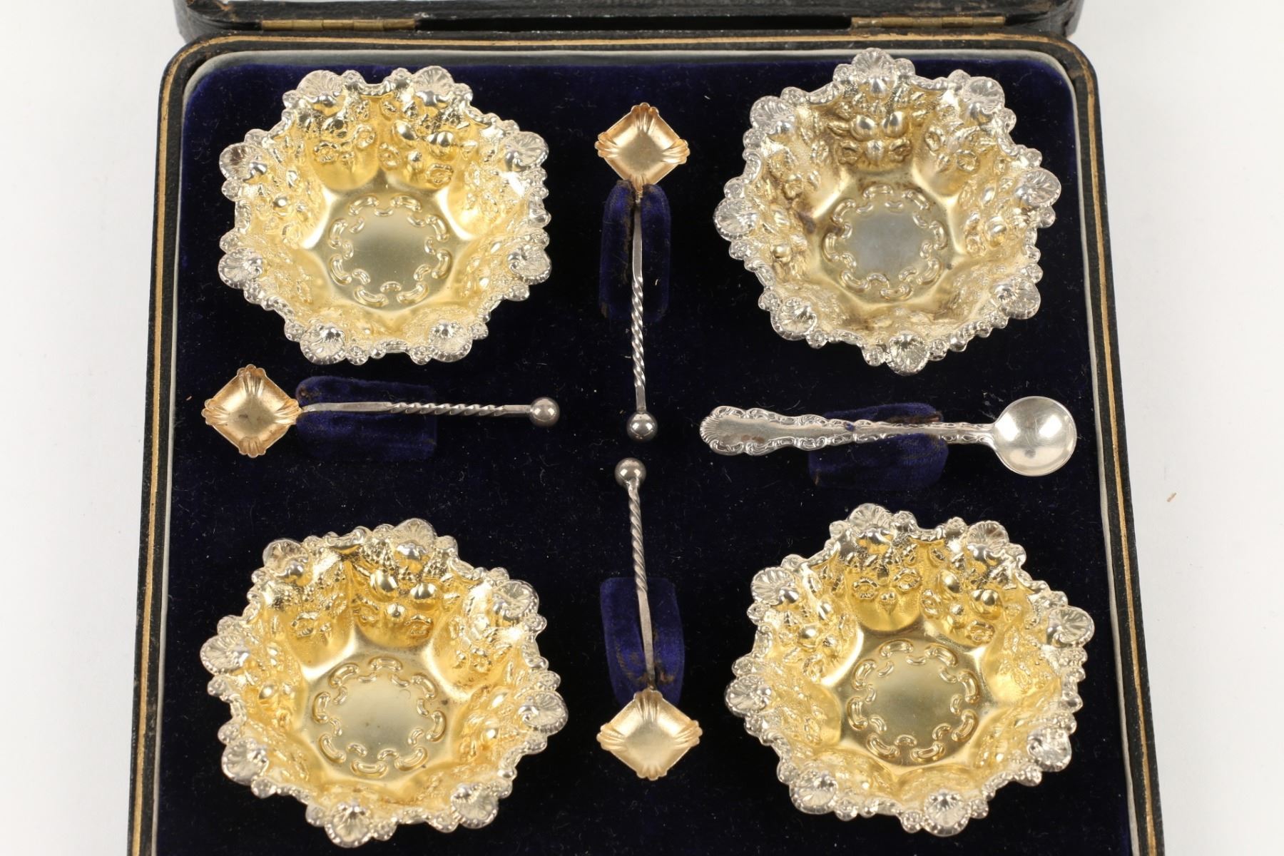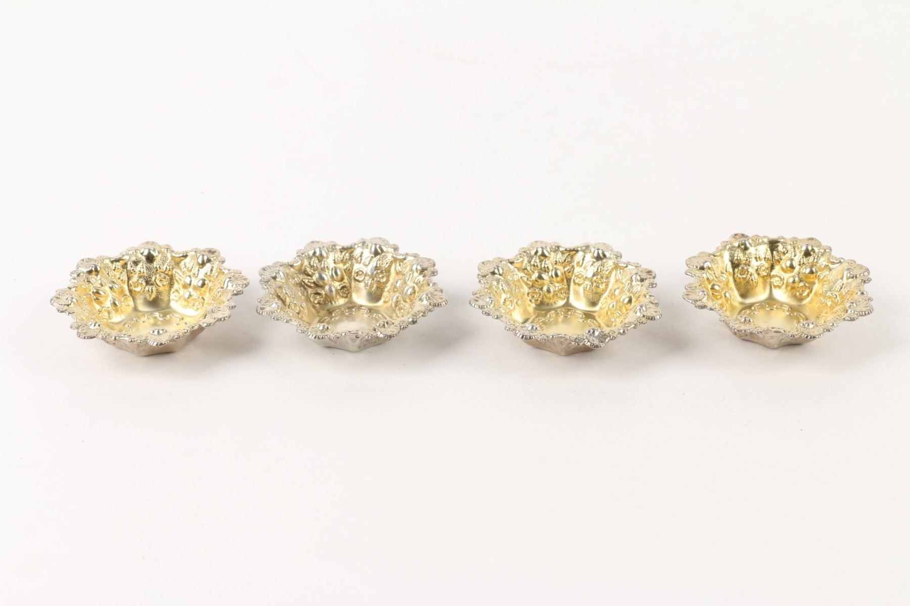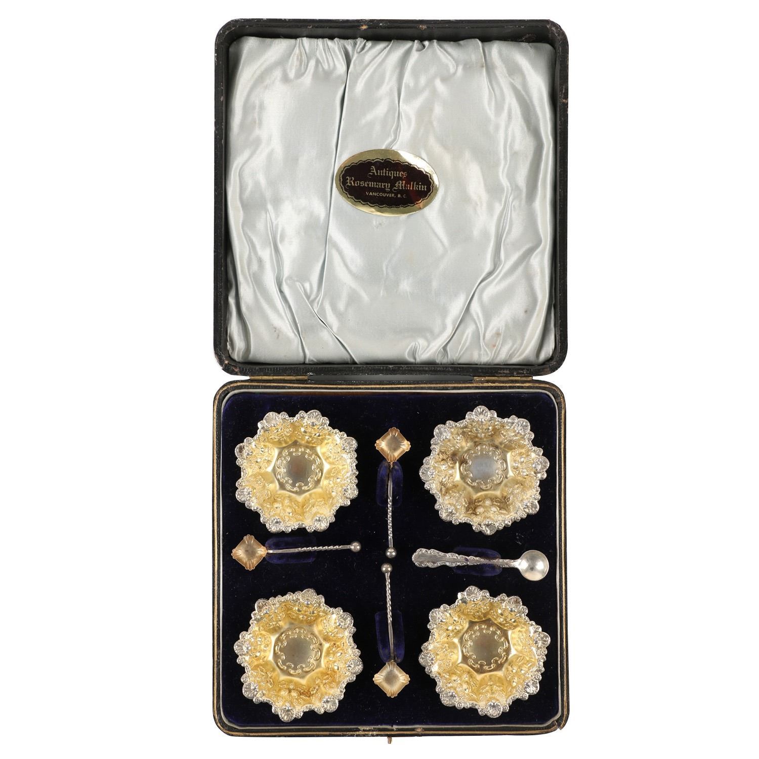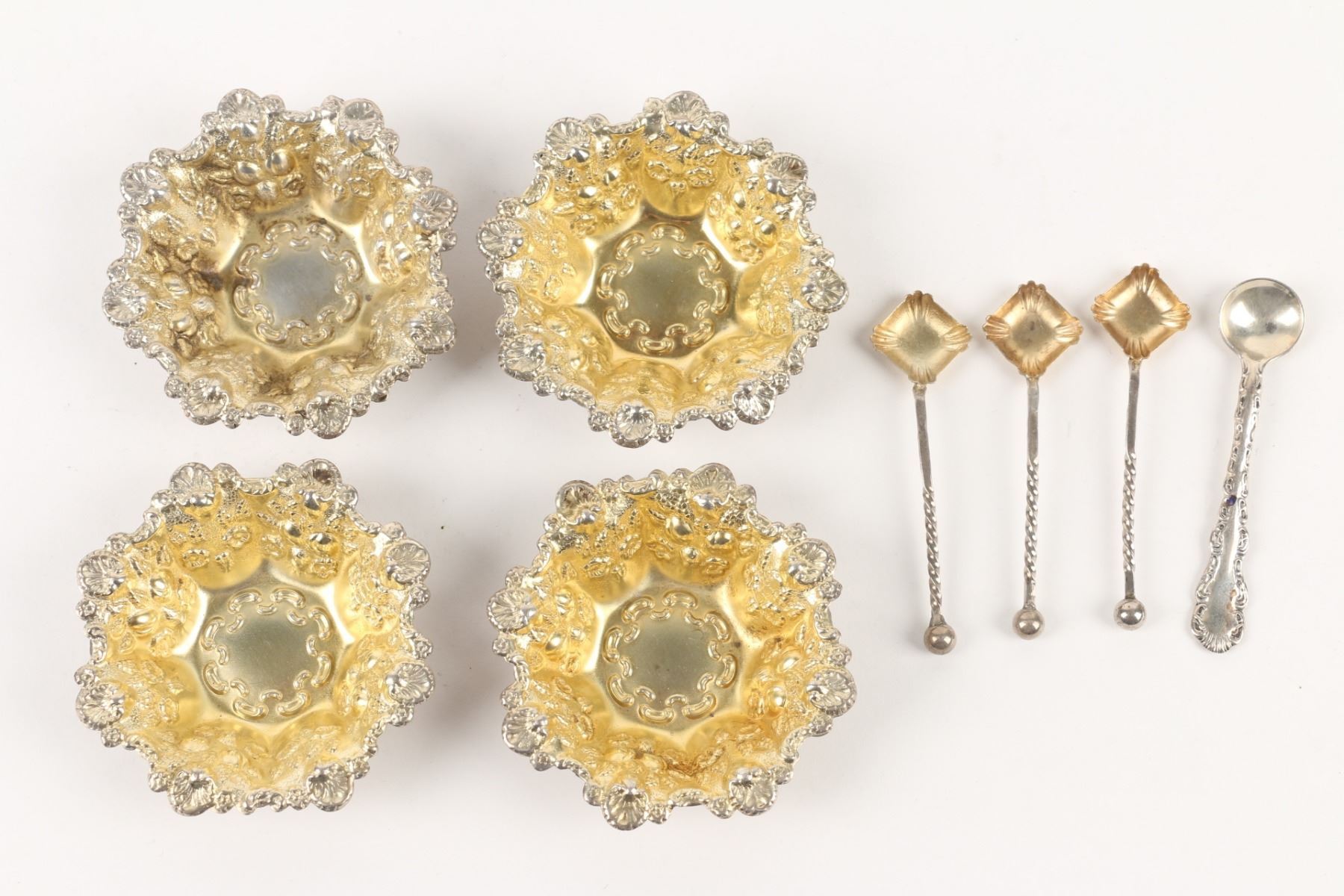 Lot 344 - Repousse silver cellars with gold-washed bowls and spoons. 1 mismatched salt spoon. Each piece hallmarked for Birmingham, 1897. 1.5" x 6.5" x 6.5". Gross weight, 56g. $100-200.