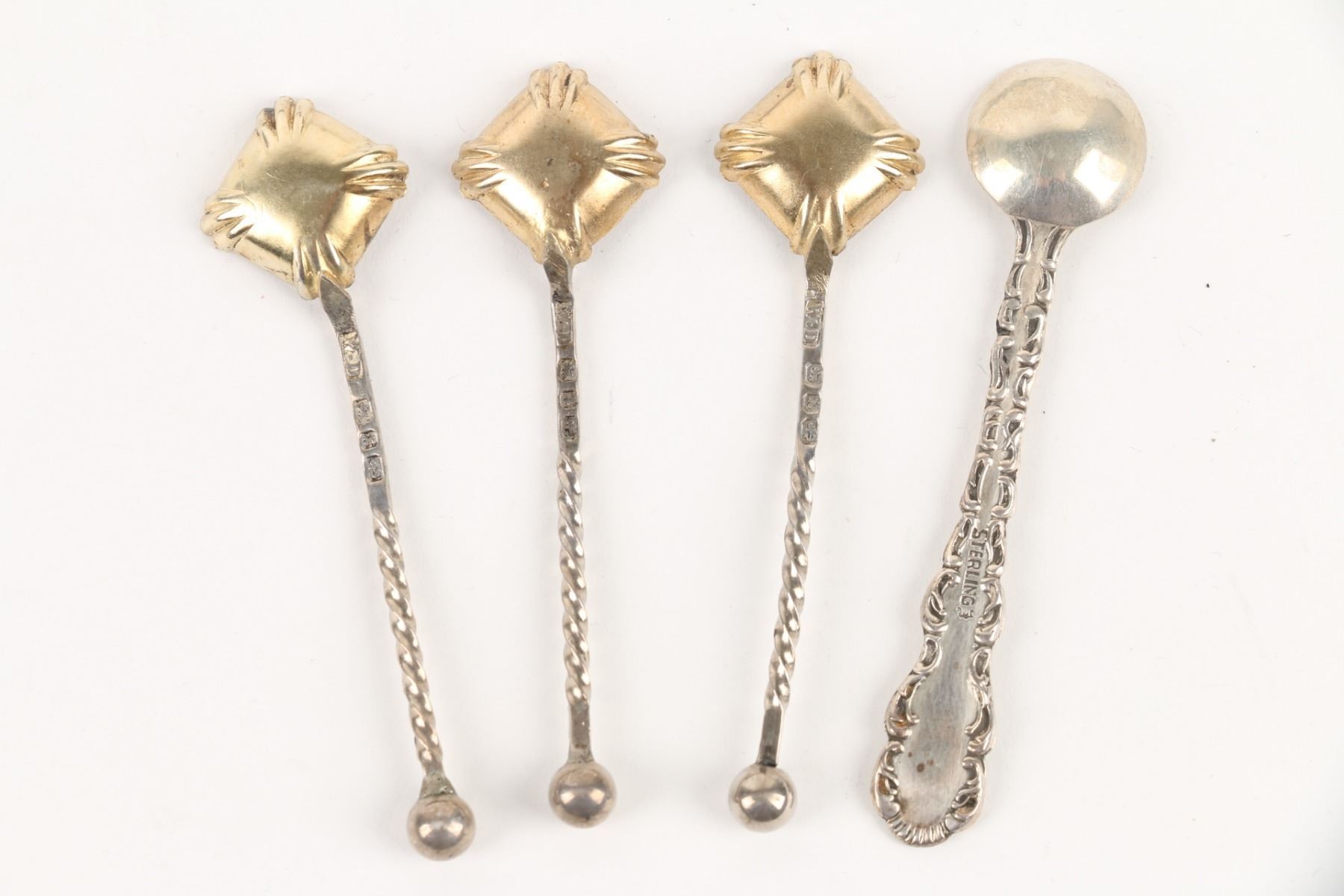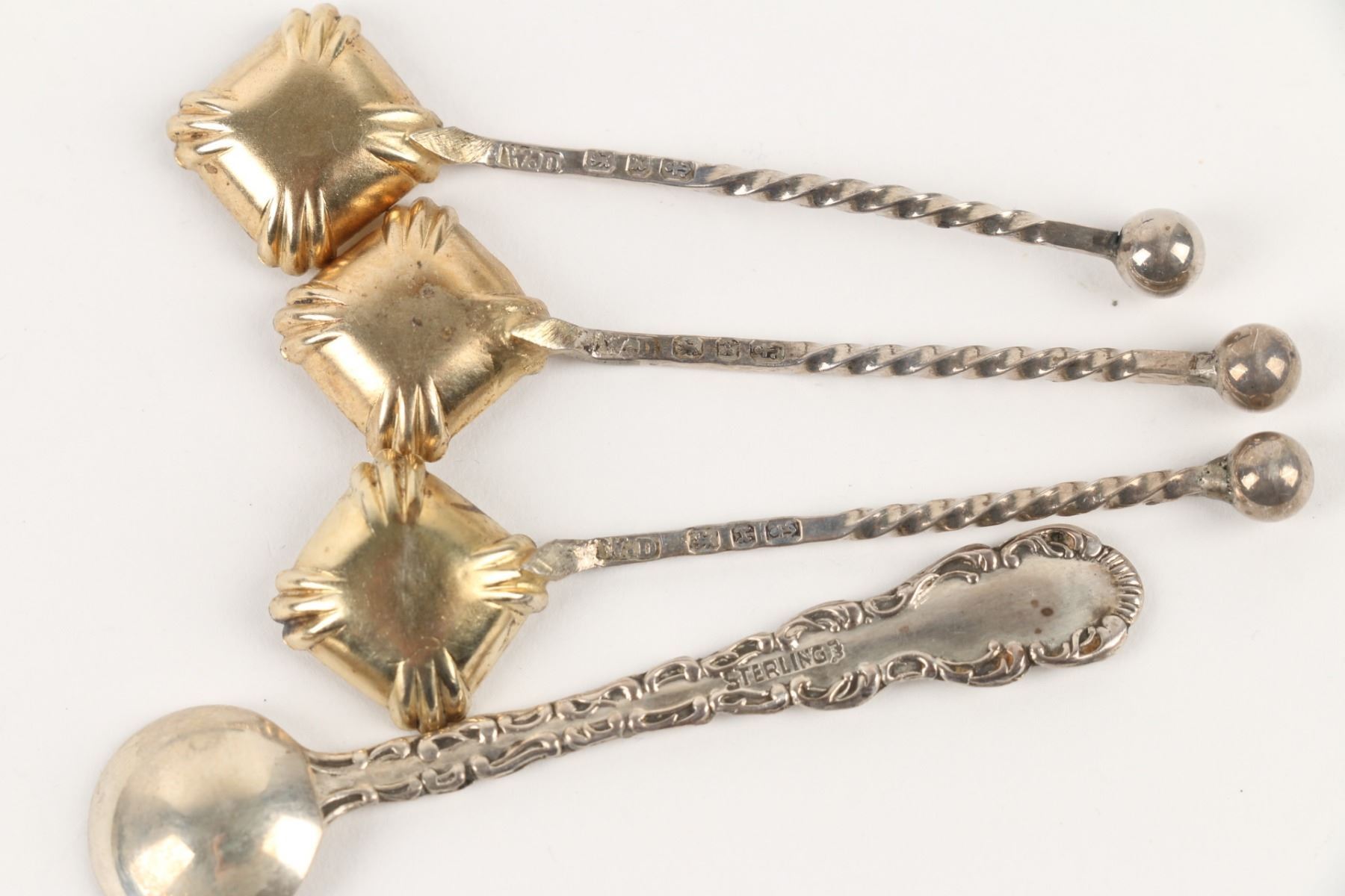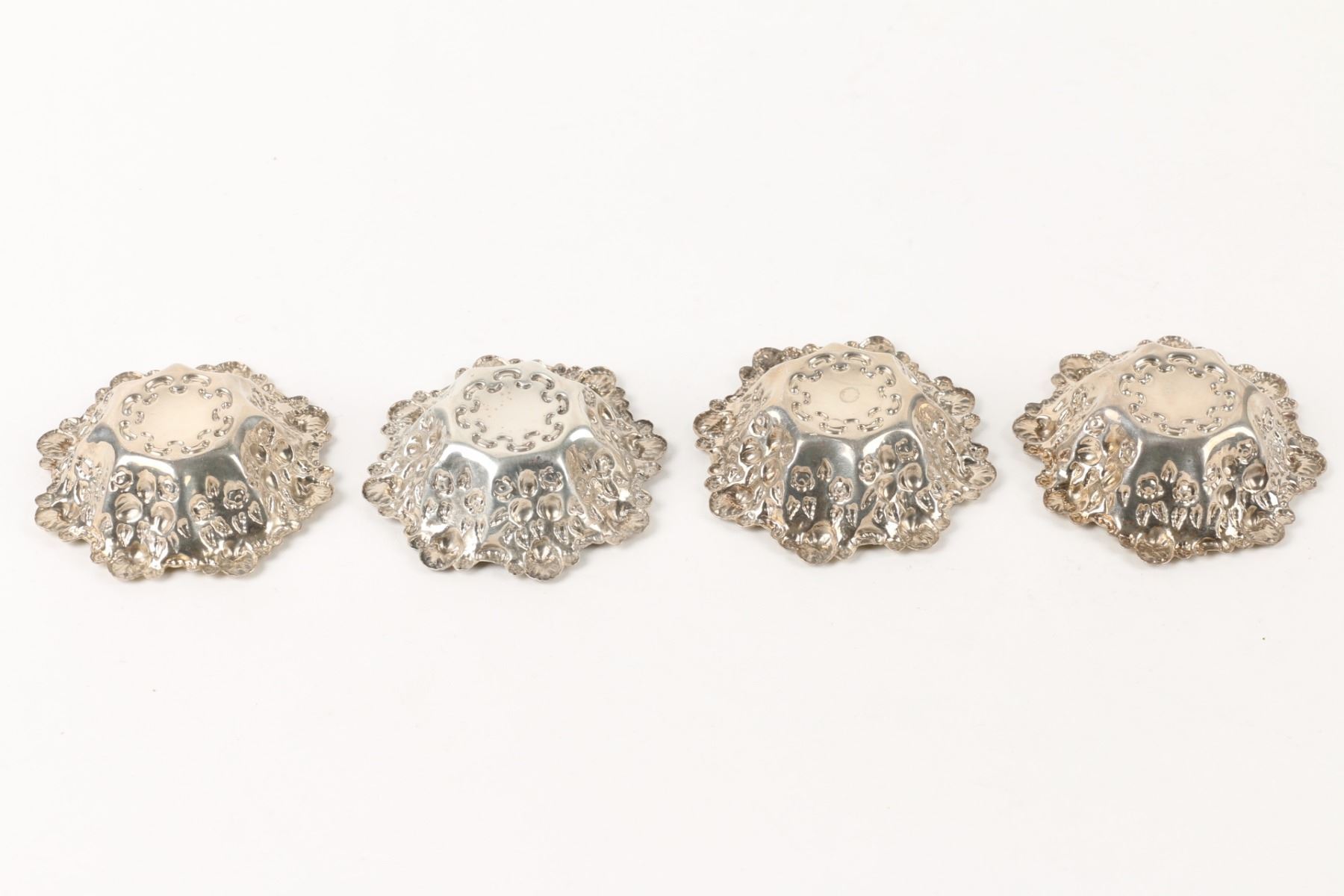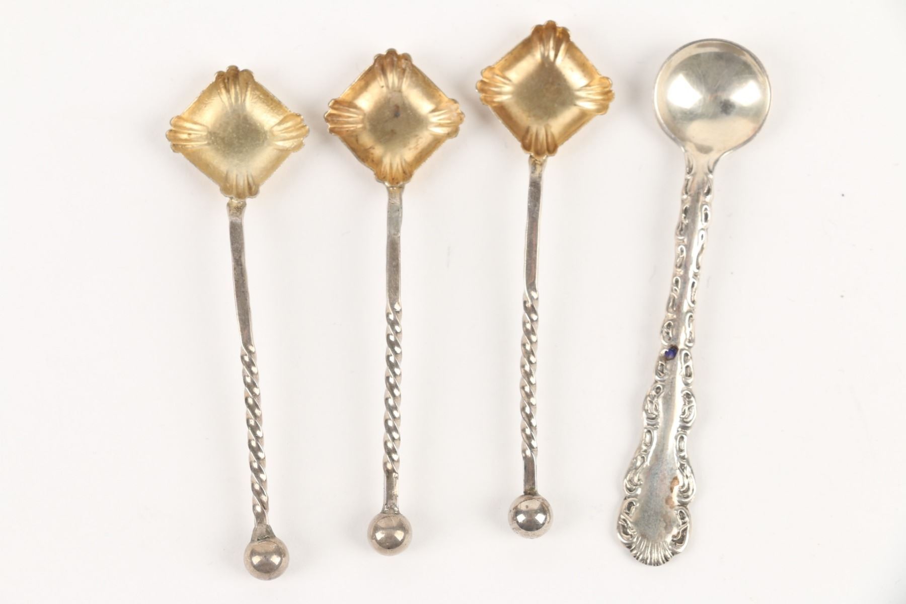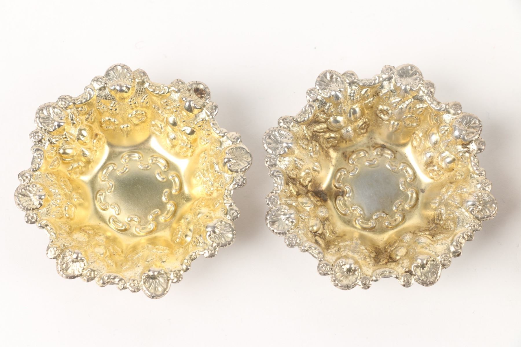 Lot 344 - Repousse silver cellars with gold-washed bowls and spoons. 1 mismatched salt spoon. Each piece hallmarked for Birmingham, 1897. 1.5" x 6.5" x 6.5". Gross weight, 56g. $100-200.