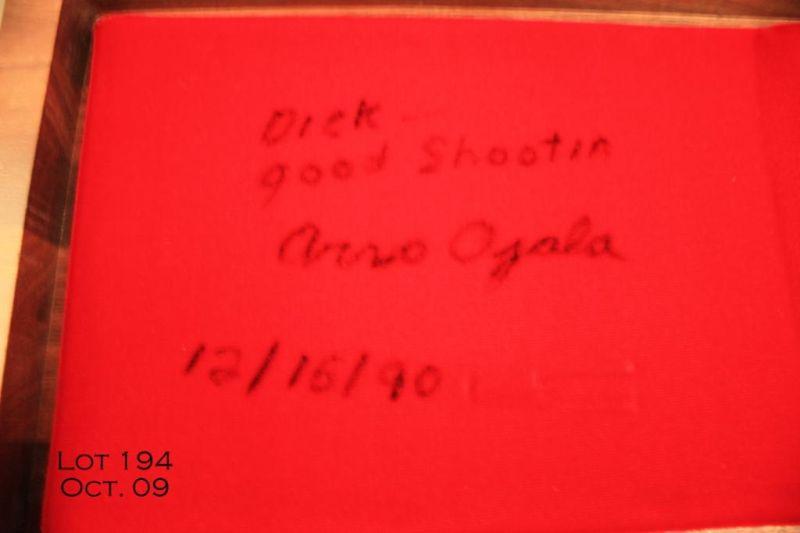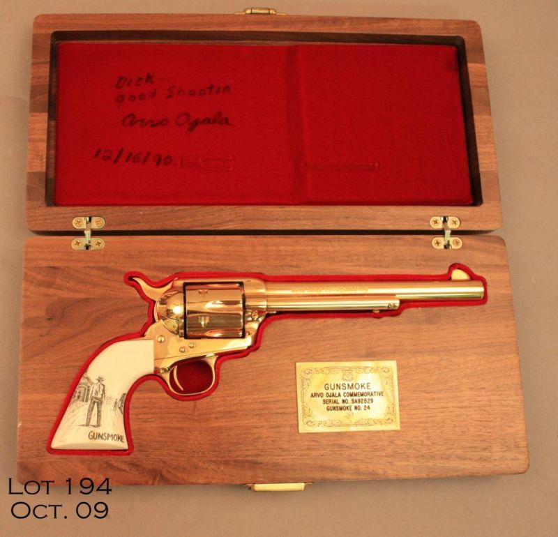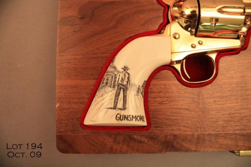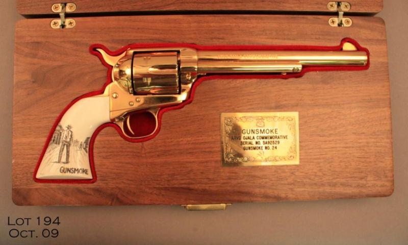 Cased Third Generation Colt SAA Arvo Ojala/Gunsmoke Commemorative revolver, .45 cal., 7-1/2” barrel, gold finish, ivory grips, #SA92529. This gun is in overall fine condition showing little handling and only a slight drag line on the cylinder; the grips show ornamentation on the right grip of the famous gunfight scene that opens every episode of the TV series “Gunsmoke”. The gun is French cased in a wood display box with brass plaque stating “Gunsmoke, Arvo OjalaCommemorative Serial No. SA92529, Gunsmoke No. 24." Est.: $1,250-$2,500.
