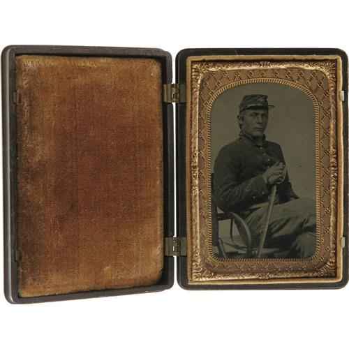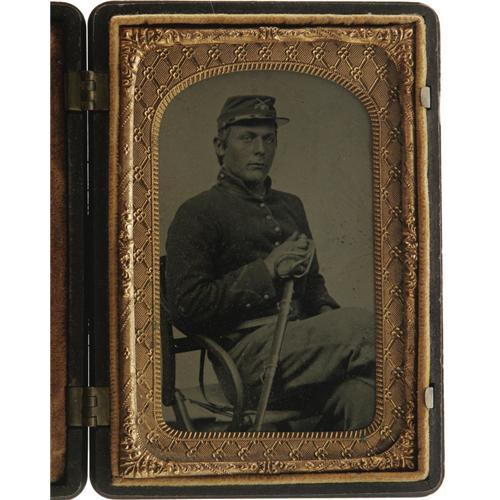 <B>Cased Tintype of an Armed Union Cavalryman.</B></I> An unusual CDV-sized image, matted to an overall 3" x 4.25". Seated in a folding camp chair, this trooper wears a standard cavalry shell jacket with a high crowned forage cap bearing crossed stamped brass sabers and the company letter "H". He grips his sheathed saber firmly while staring directly into the camera. In a brass matt and housed in a gutta-percha case decorated with molded geometric floral designs on both sides. A few minor edge nicks, else very fine condition.<BR><BR><b>Shipping:</b> Miscellaneous Collectibles, Smal (<a target="_blank" href="http://www.heritageauctions.com/common/shipping.php">view shipping information</a>)