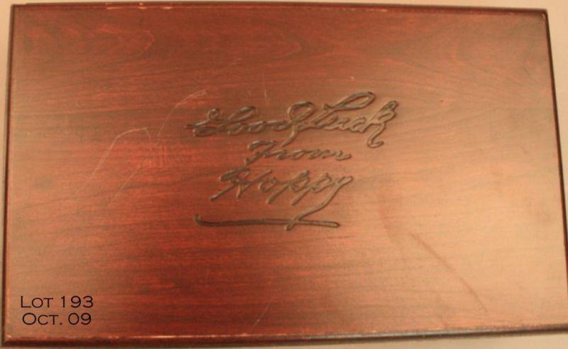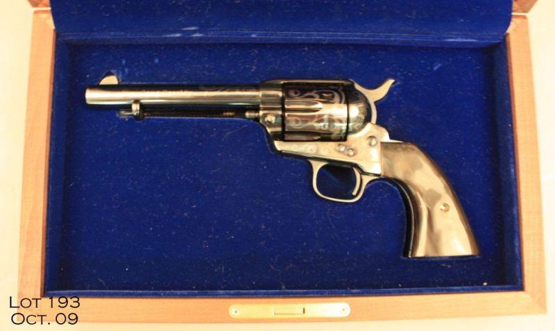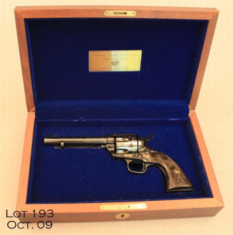 Cased United States Historical Society Hopalong Cassidy Six Shooter Commemorative copy of a Colt SAA revolver, .45 cal., 5-1/2” barrel, blue finish, faux horn grips, #4-SA580. This gun is in overall fine condition showing little handling and just a slight cylinder drag line; silver ornamented in a light vine style with “Hopalong Cassidy” on both sides of the barrel. The case is of wood, nicely lined and the lid is marked “Good Luck from Hoppy”. Est.: $1,250-$2,500.