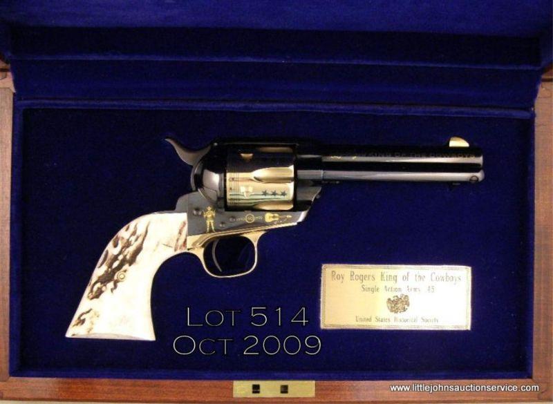 Cased United States Historical Society Single Action Commemorative Roy Rogers King of the Cowboys revolver, .45 cal., 4-3/4” barrel, blue and gold finish with stag grips, #4. This gun is in excellent condition showing little handling;the frame, backstrap, hammer and barrel assembly are blue finished with the cylinder, front sight and trigger guard strap gold finished; the frame is ornamented with an image of Roy, guitars and the 50 years of entertainment and public servicelogo; the cylinder is ornamented with stars and musical score, the barrel is marked “U.S. Historical Society” and “Roy Rogers, KING OF THE COWBOYS”. The presentation case is of hardwood and lined with a brass Commemorative plaque inset. A low serial number Commemorative revolver. Est.: $1,250-$2,500.