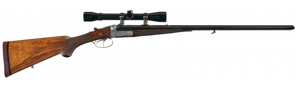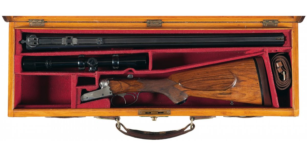 No maker's marks are present. The barrel flats are marked with various German proofmarks, serial number and caliber designation "8,7 mm/57". The bottom of each barrel is marked ""GJSSSTAHL KRUPP-ESSEN". The front sight bead has been removed, there is a fixed open rear sight on the matte solid rib and integral claw mount scope bases. There is a 1 inch wedge of floral scroll engraving on the breech end of each barrel and a shell design on the dolls head extension. The scallop box lock action has relief engraved oak leafs and acorns on the fences and light scallop bordering on the receiver. Tang mounted manual safety, adjustable double triggers, the action was casehardened with the remaining parts blue, and mounted with a multi-point checkered walnut splinter forearm with lightly engraved hardware, a horn forend insert and pistol grip stock with teardrop flats, horn grip cap, cheekpiece, sling swivel base and solid Noshoc recoil pad with 1/4 inch black spacer. Length of pull is 14 1/2 inches. Comes in a oak and leather case with brass corner protectors and hardware, leather handle, red felt lining, two leather straps and a Bausch & Lomb scope.