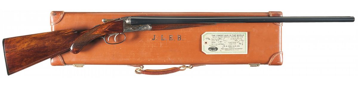 This example was manufactured circa 1924. The receiver has the late style floral scroll engraving. There is a spiral engraved on the ends of the hinge pin and a decorative pattern on the trigger guard. The barrels have a single steel bead sight, are choked .011/.029 and have 2 1/2 inch chambers with ejectors. The bottom of both barrels are stamped with a "4". Mounted on a multi-point checkered walnut forearm and round knob pistol grip stock with serrated hard rubber buttplate. Length of pull is 14 1/8 inches. With a leather covered takedown hardcase with "J L E B" embossed in black on the lid, a nickel plated oiler, two nickel plated snap caps, a horn handled screwdriver, pull through cleaning kit in a pouch and the original hang tag that matches everything except the gauge.
