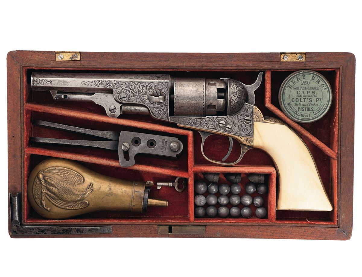 Colt Model 1862 Pocket Navy revolver manufactured in 1861. The revolver has bold New York style Germanic scroll engraving on a punch-dot background on the sides of the barrel, frame, back strap and trigger guard. The top of the barrel is roll-stamped with the legend "ADDRESS COL. SAML COLT NEW-YORK U.S. AMERICA" in one line in a panel with engraved double-line borders. The top and sides of the barrel surrounding the panel are engraved with double-line flourishes. The cylinder is roll-engraved with the Stagecoach Holdup scene and "COLTS PATENT". The rebated portions of the cylinder are decorated with engraved scallop and dot borders. The left side of the frame is roll-stamped with the "COLTS/PATENT" marking in two lines in a raised oval panel surrounded by scrollwork. The bottom of the barrel lug and the frame ahead of the trigger guard are not engraved. The hammer has bordered knurling on the spur but has no engraving. The full serial number, "8001" is stamped on the wedge, cylinder arbor pin, bottom of the barrel lug, frame, trigger guard and the side of the cylinder. All of the visible serial numbers match. The special Colt factory markings for engraved and special finish arms (usually an "E", "I" or "P" typically stamped above or below the serial number on the barrel lug, frame, trigger guard and back strap) are not present on this revolver. The revolver has a one-piece ivory grip. The revolver is complete with a mahogany case with five compartments lined with red felt. The case contains: a 250 cap tin of percussion caps for Colt belt and holster pistols with a green paper Eley Bros label and black japanned body, a blued iron straight leg double cavity bullet mold with "COLTS/PATENT" on the sprue cutter and "36B" on the right block, an L-shaped combination screw-driver/nipple wrench with blue finish, an 1848/1849 Pocket Model powder flask with fixed charger that features an embossed eagle with a revolver in its left talon on both sides of the flask but lacks the "COLTS/PATENT" markings, case key and assorted .36 caliber lead balls and conical bullets.