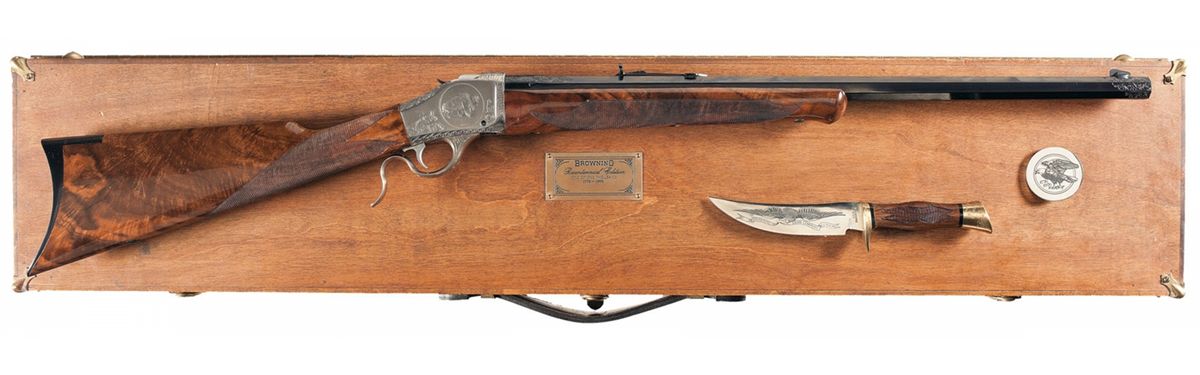 Manufactured in 1976. There is floral scroll engraving on the lever, barrel, buttplate and receiver with an eagle engraved on the left side of the receiver and a bison on the right side of the receiver. Fixed front and elevation adjustable rear sights. Mounted on a wonderfully figured multi-point checkered walnut forearm with Schnabel tip and straight grip stock with steel buttplate. With a medallion numbered to the gun with an eagle on one side and a motto on the opposite. There is also a knife etched with an eagle on one side of the blade and a herd of bison on the other side with a multi-point checkered walnut grip, brass guard and brass pommel. There is floral scroll engraving on the brass and it is numbered to match the gun. With a hardwood case with a plaque on the lid and lined in red cloth.