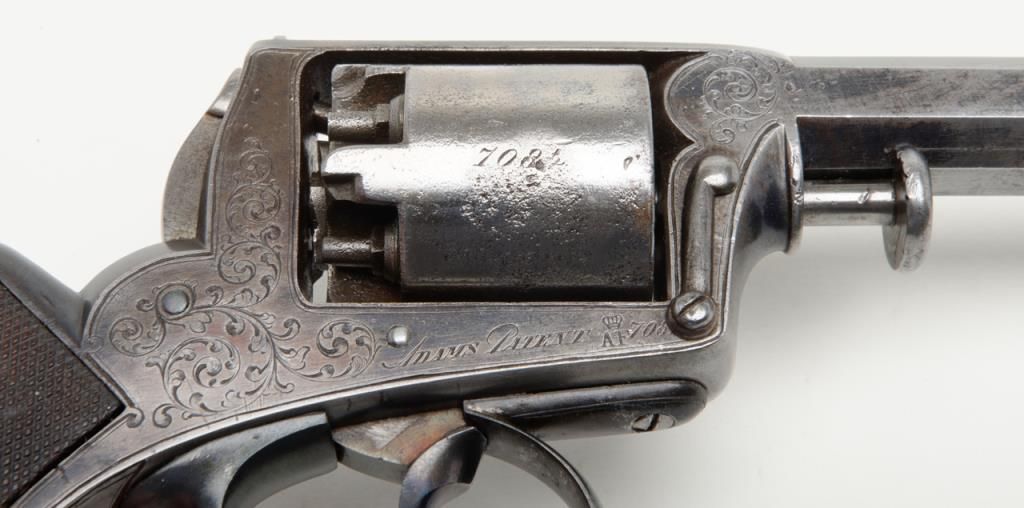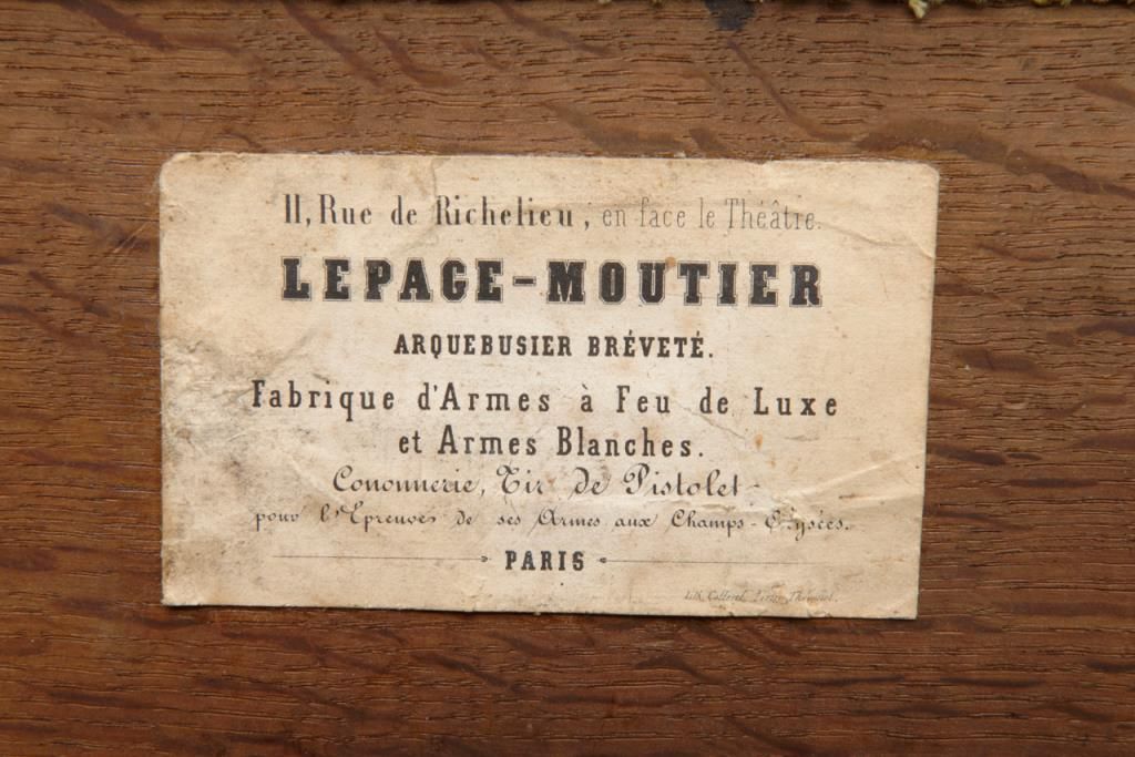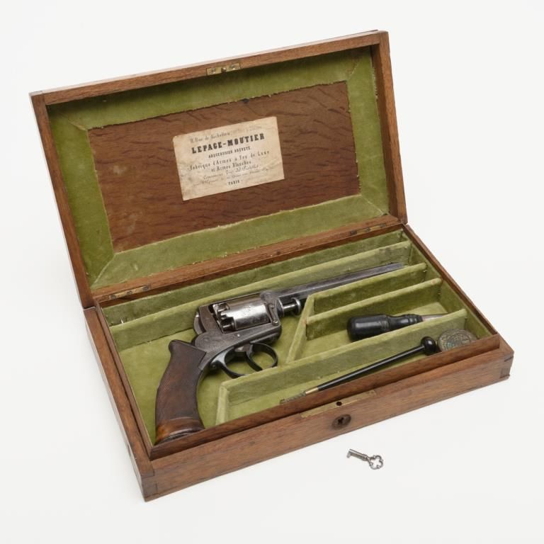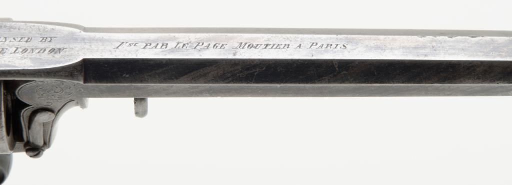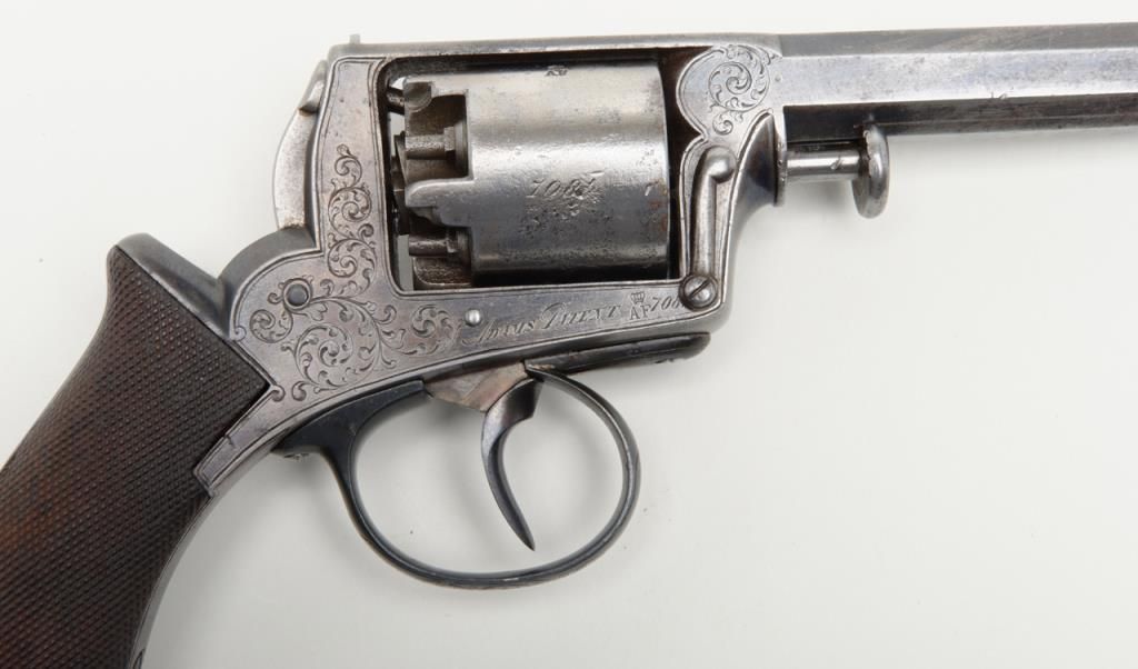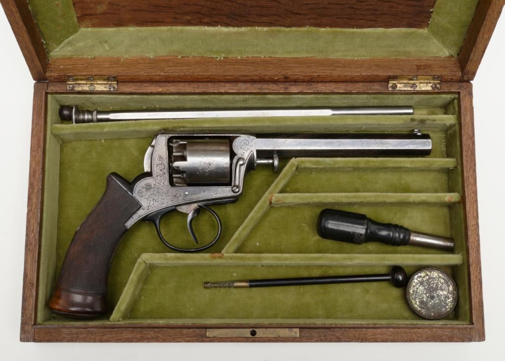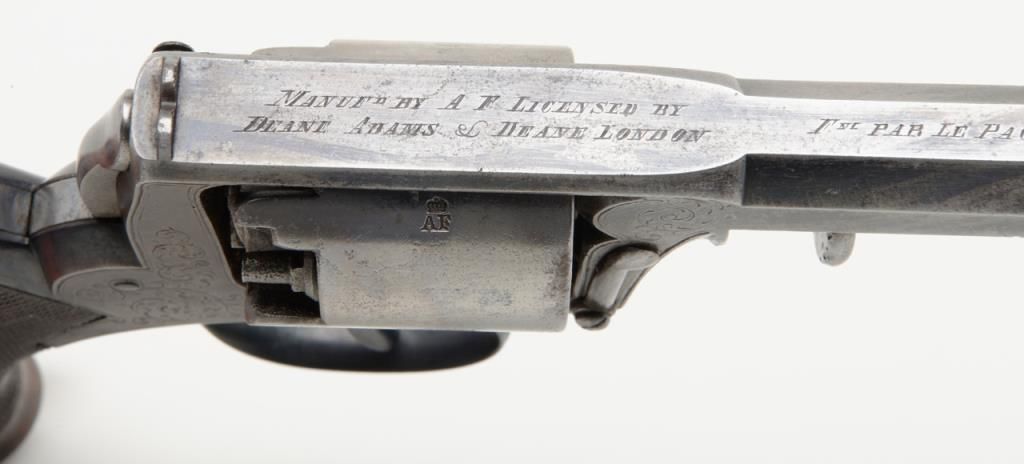 Cased double action percussion revolver with Adams patent markings and A.F. proof probably indicating manufacture by August Francotte of Liege. The top strap is hand engraved and reads “Manufactured by A.F., Licensed by Deane Adams and Deane, London, Made for Le Page, Moutier of Paris”. The pistol measures 12 ½” overall with a 6 1/8” octagon barrel of approximately .44 caliber. The metal surfaces show some light cleaning and about 20% to 40% original blue with some minorerosion and pinprick pitting where the finish has been lost. The grips are nicely checkered and in good condition. The frame is stamped Adams patent on the left side and hand engraved on the right side with a number. The revolver is double actiononly with no hammer spur. The pistol is contained within an original to the period case and it has been relined with the original paper label retained in the lid. The condition of the interior is very good and was redone a long time ago as it shows age. The case contains a cleaning rod and associated tool which we could not identify along with a key, cap tin and a driving rod. The exterior of the case is light-colored oak missing its key plate and the top plate is replaced. The