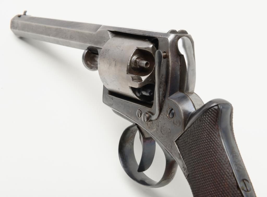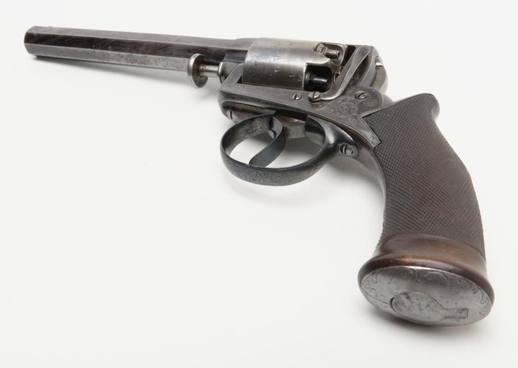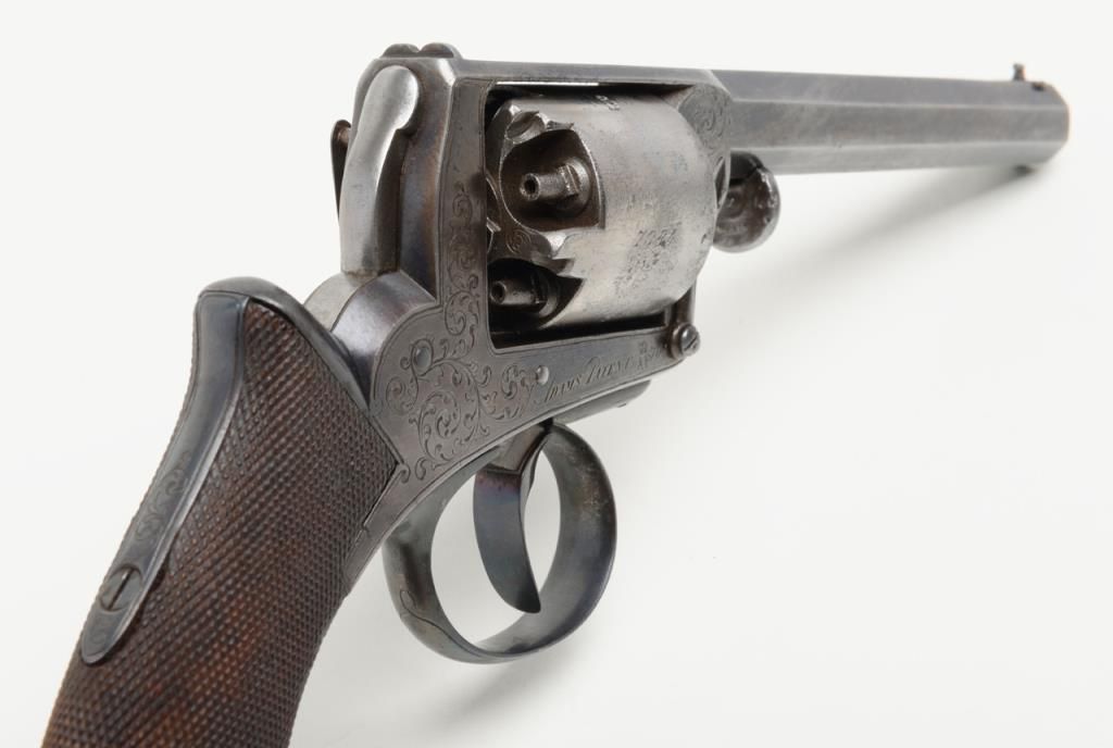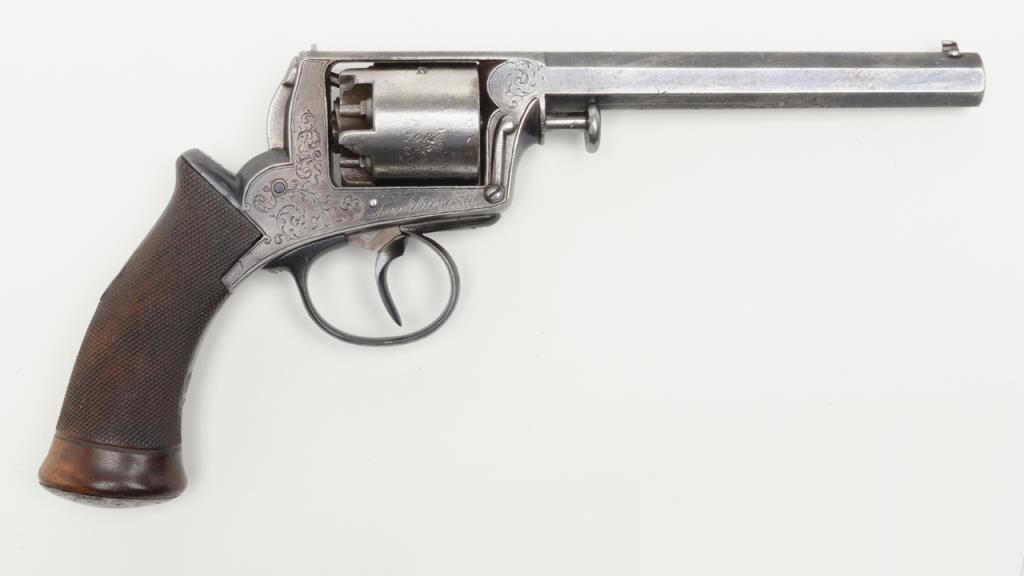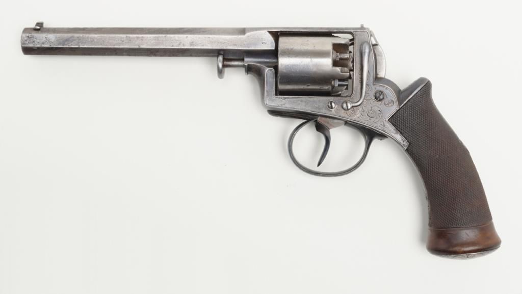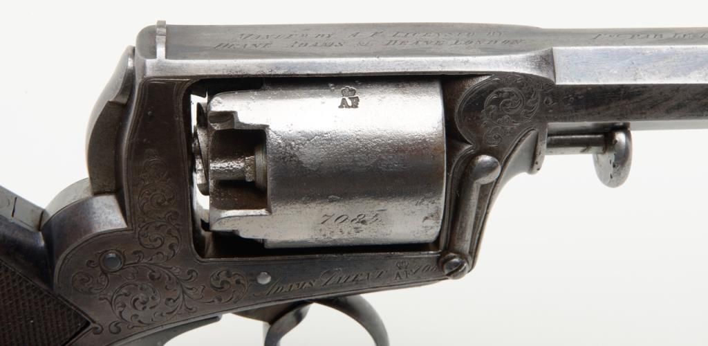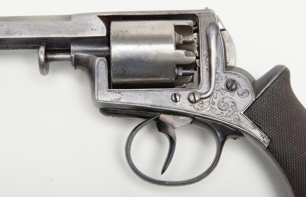 Cased double action percussion revolver with Adams patent markings and A.F. proof probably indicating manufacture by August Francotte of Liege. The top strap is hand engraved and reads “Manufactured by A.F., Licensed by Deane Adams and Deane, London, Made for Le Page, Moutier of Paris”. The pistol measures 12 ½” overall with a 6 1/8” octagon barrel of approximately .44 caliber. The metal surfaces show some light cleaning and about 20% to 40% original blue with some minorerosion and pinprick pitting where the finish has been lost. The grips are nicely checkered and in good condition. The frame is stamped Adams patent on the left side and hand engraved on the right side with a number. The revolver is double actiononly with no hammer spur. The pistol is contained within an original to the period case and it has been relined with the original paper label retained in the lid. The condition of the interior is very good and was redone a long time ago as it shows age. The case contains a cleaning rod and associated tool which we could not identify along with a key, cap tin and a driving rod. The exterior of the case is light-colored oak missing its key plate and the top plate is replaced. The