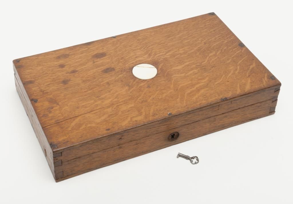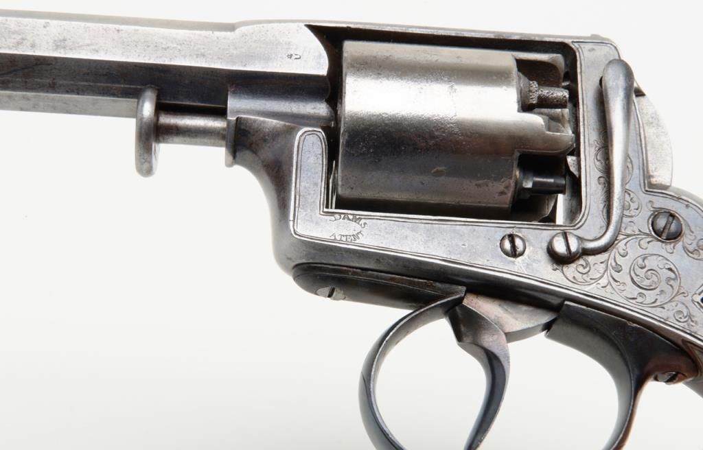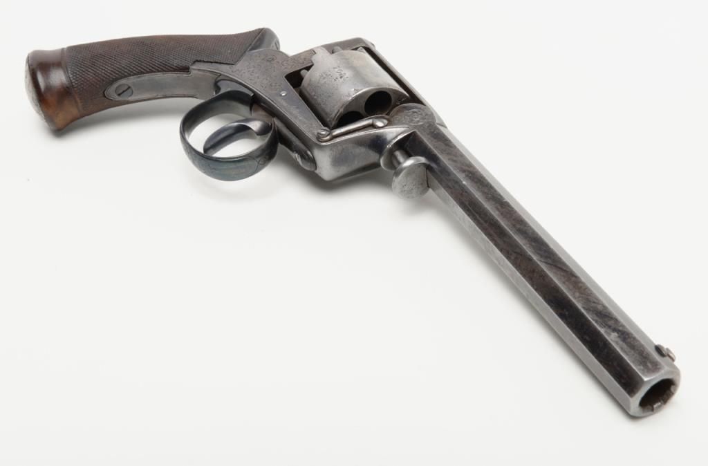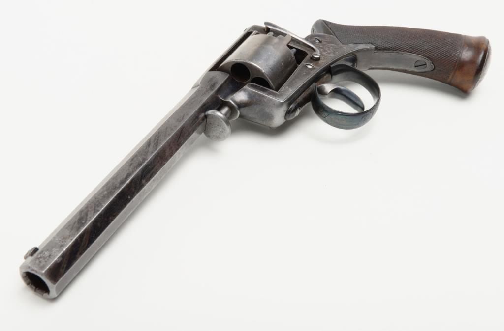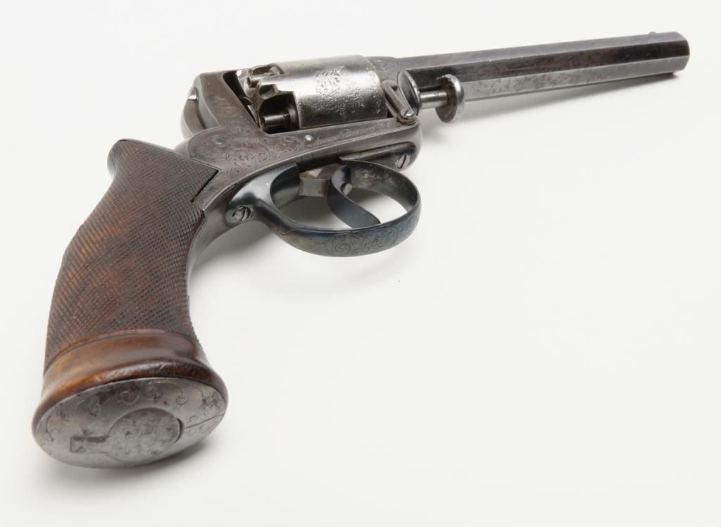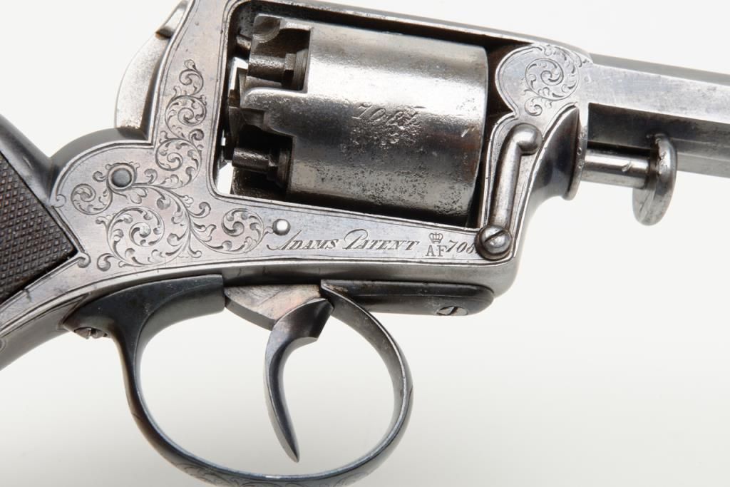 Cased double action percussion revolver with Adams patent markings and A.F. proof probably indicating manufacture by August Francotte of Liege. The top strap is hand engraved and reads “Manufactured by A.F., Licensed by Deane Adams and Deane, London, Made for Le Page, Moutier of Paris”. The pistol measures 12 ½” overall with a 6 1/8” octagon barrel of approximately .44 caliber. The metal surfaces show some light cleaning and about 20% to 40% original blue with some minorerosion and pinprick pitting where the finish has been lost. The grips are nicely checkered and in good condition. The frame is stamped Adams patent on the left side and hand engraved on the right side with a number. The revolver is double actiononly with no hammer spur. The pistol is contained within an original to the period case and it has been relined with the original paper label retained in the lid. The condition of the interior is very good and was redone a long time ago as it shows age. The case contains a cleaning rod and associated tool which we could not identify along with a key, cap tin and a driving rod. The exterior of the case is light-colored oak missing its key plate and the top plate is replaced. The
