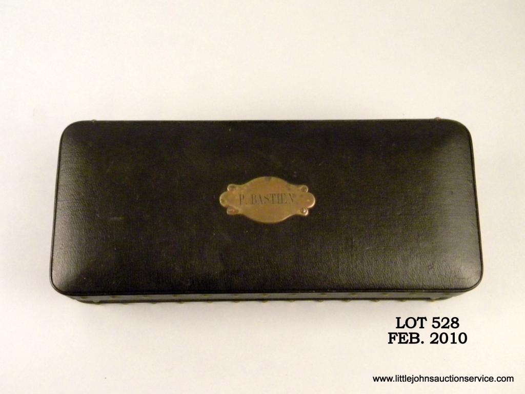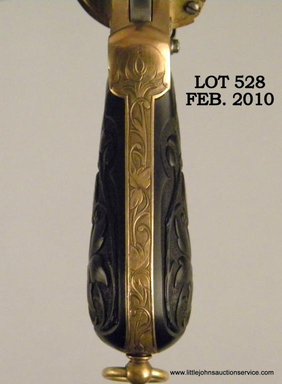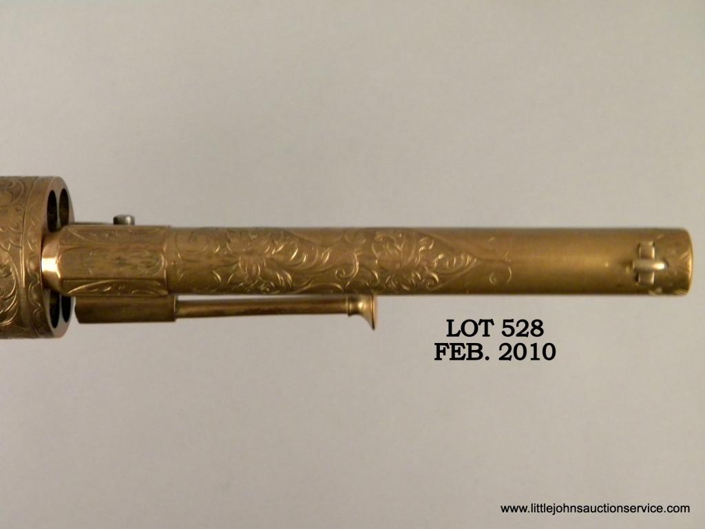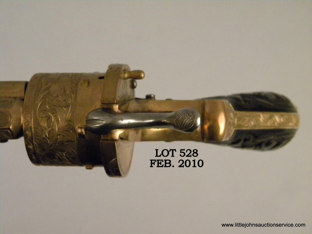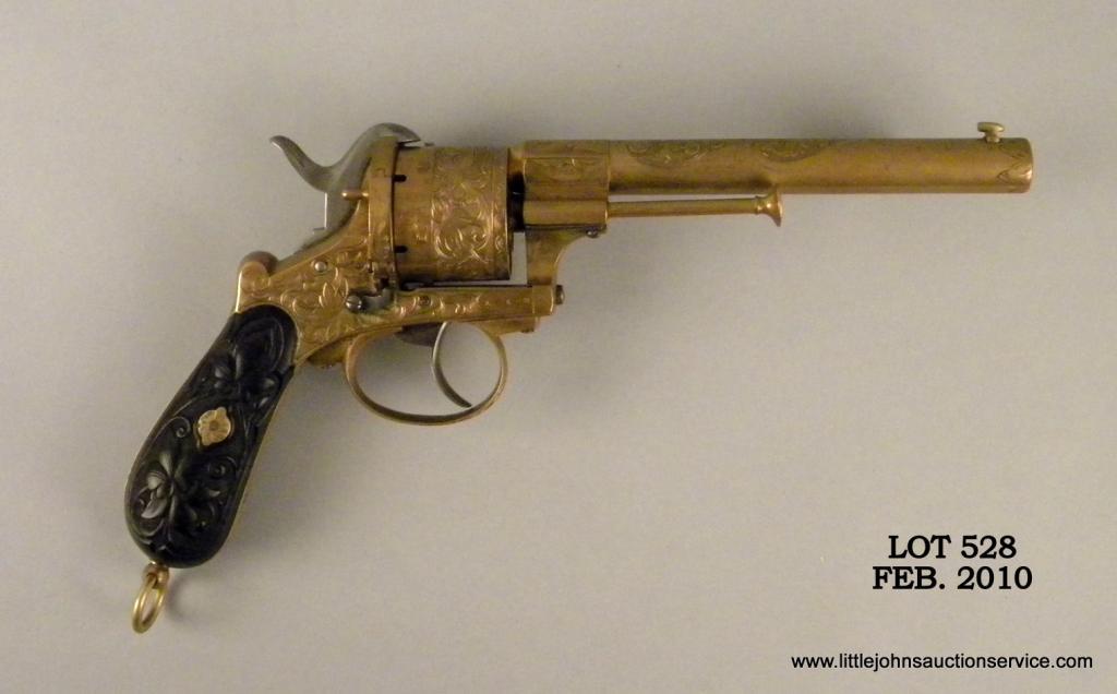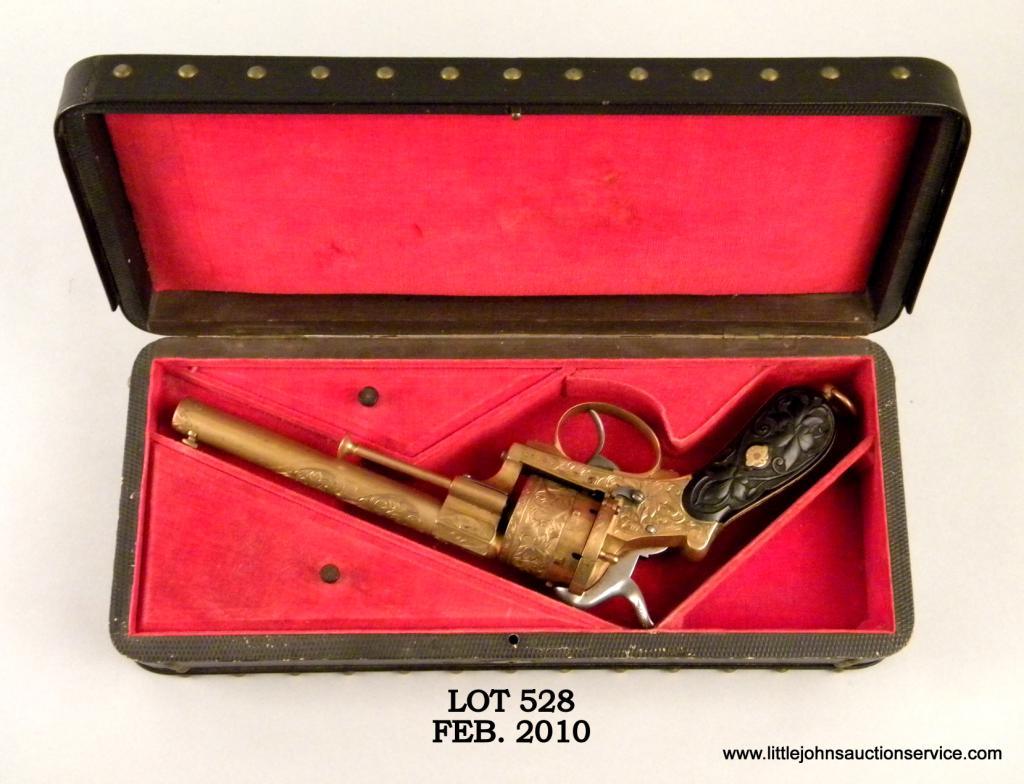 Cased engraved and Gold washed large frame brass DA Pinfire Revolver, 11mm cal., 6 1/4" round barrel, raised carved Ebony grips, #10178. This gun is in overall excellent condition showing relief vine & flower engraving on the frame, cylinder, barrel and trigger guard, Belgian proofs, approx. 60% Gold wash over brass remaining, steel hammer & trigger, lanyard ring in butt, swing down loading gate, excellent raised carved Ebony grips in vine and flower motif that matches the engraving on the gun. Crisp action, good bore, ejector rod retained. The leather covered wood case is in very good condition measuring approx. 14" x 6" x 3" with brass presentation plaque on lid marked "P. Bastien" and trimmed in brass tacks, the interior shows its original red material lining with two compartments with lids and shows only slight wear from the recoil shield, a functioning key is also present. A seldomly found variation of a large frame pinfire revolver with an inscription on the lid that may be researchable. Est. $5,000-8,000