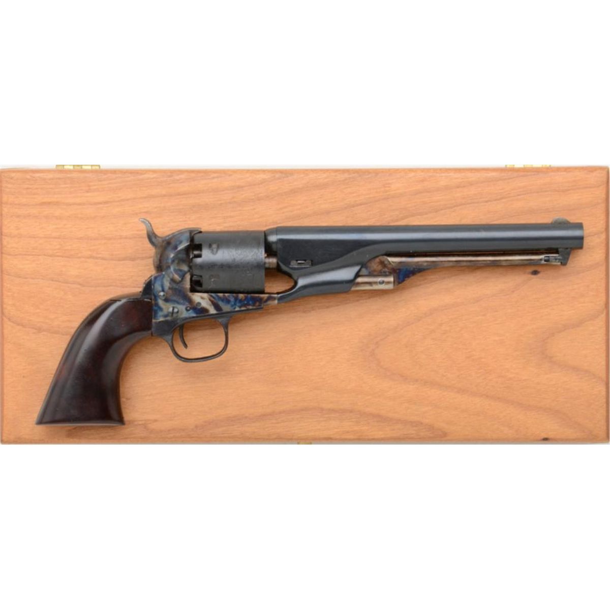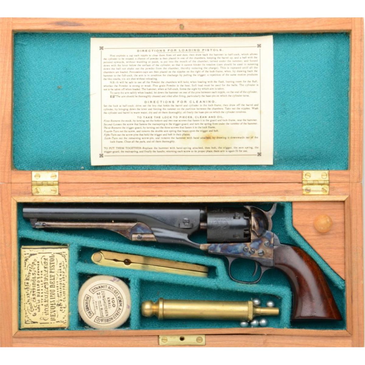 Cased miniature of a Colt Model 1861 Navy percussion revolver, #063, cut for shoulder stock and with accessories including cap tin, skin cartridge pack, bullet mold and powder flask; also compartment with miniature leadballs; whole set is in overall excellent condition showing little handling. Est.: $400-$800.