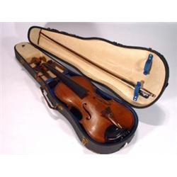 Cased mother-of-pearl and silver inlaid violin with paper label to interior