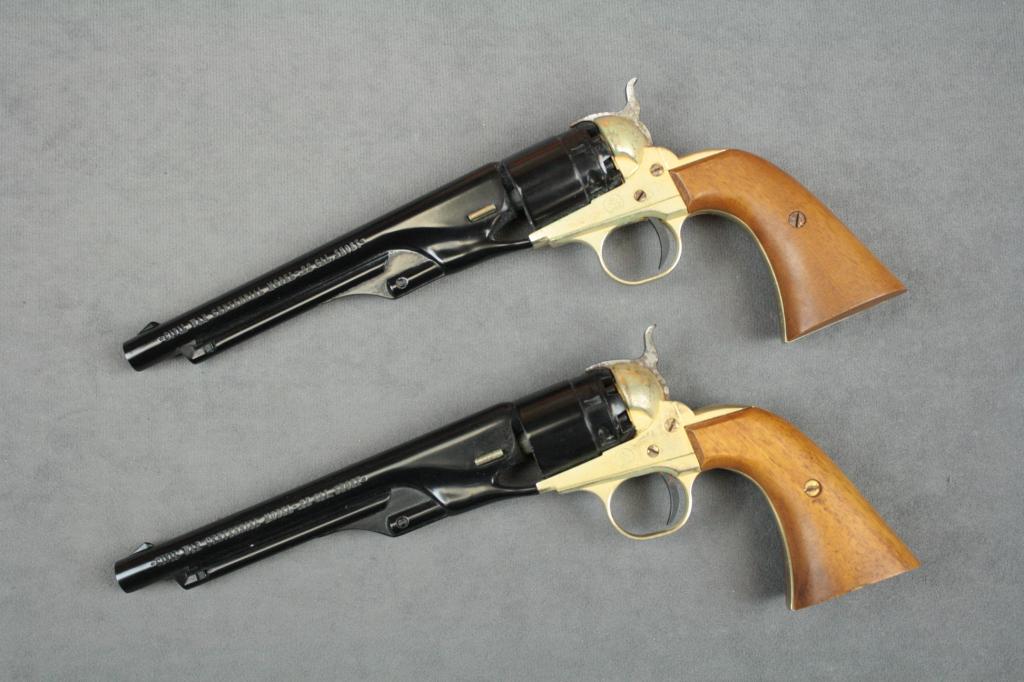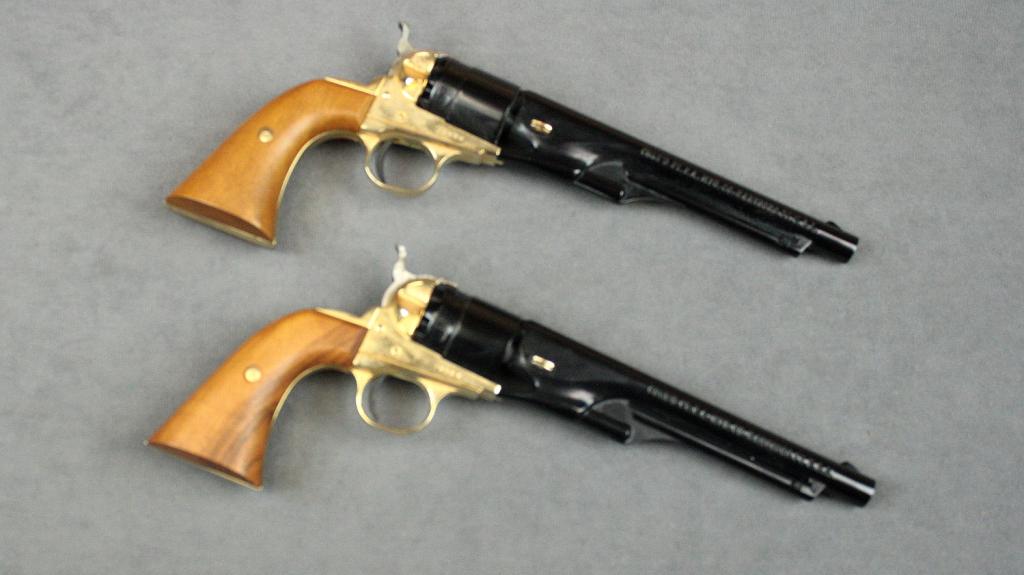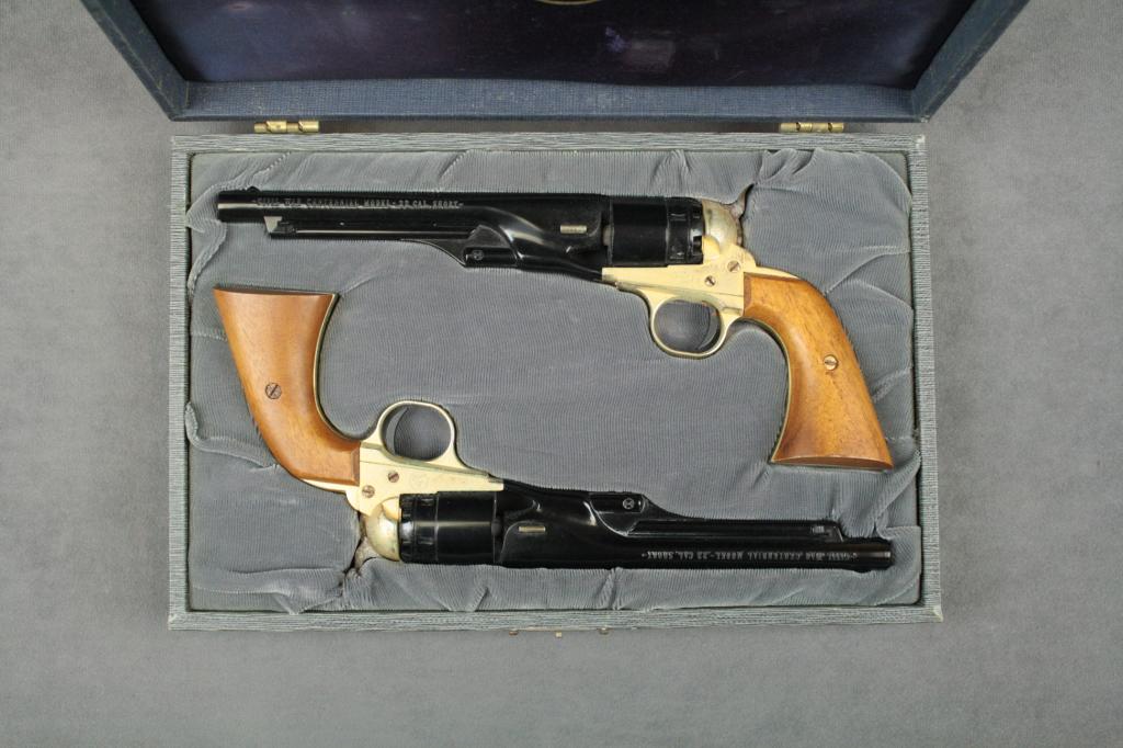 Cased pair of Colt Civil War Centennial Model diminutive .22 short single shot pistols designed in the form of the famous Colt Model 1860 Army revolver, 6” barrels, black and gold finish, smooth wood grips, #s 7898W and7899W. These guns are in overall very good to fine condition showing little handling; some frosting of the gold finish on the frames from storage; very good + case. Est.: $200-$300.