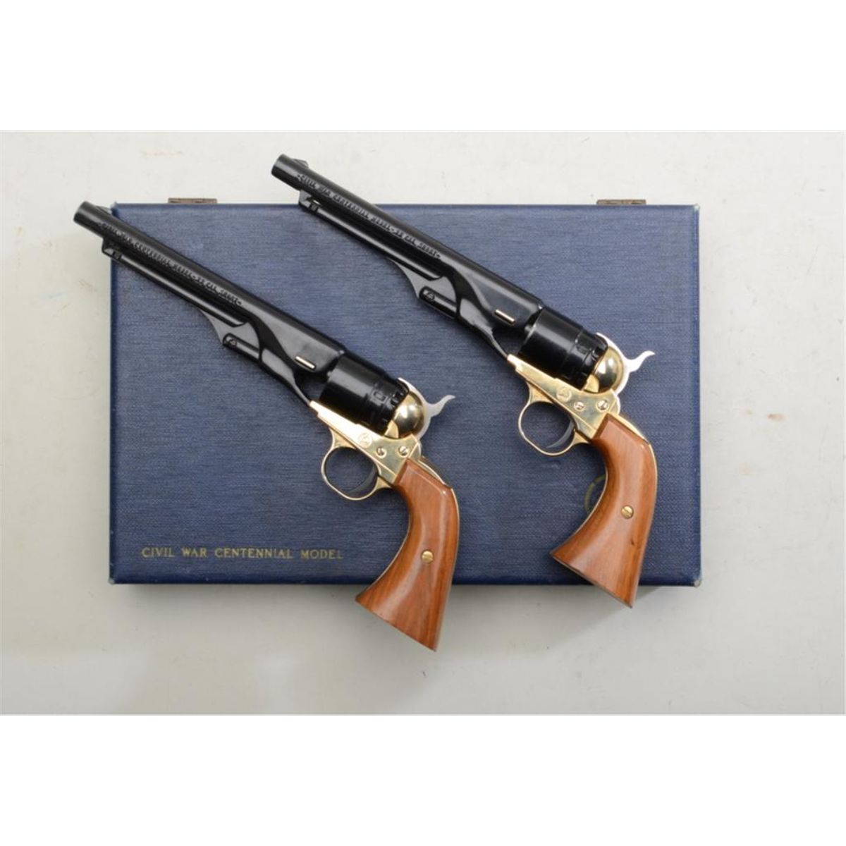 Cased pair of Colt Civil War Centennial Model modern diminutive copies of the Colt Model 1860 Army percussion revolver, .22 short cal., 6” barrels, blue and gold finish, smooth wood grips, #20784W &20783W. Thesesingle shot guns are in overall excellent condition showing little handling or use; presentation lined case is in overall fine condition; with Colt certificate and associated paperwork. Est.: $225-$350.