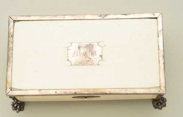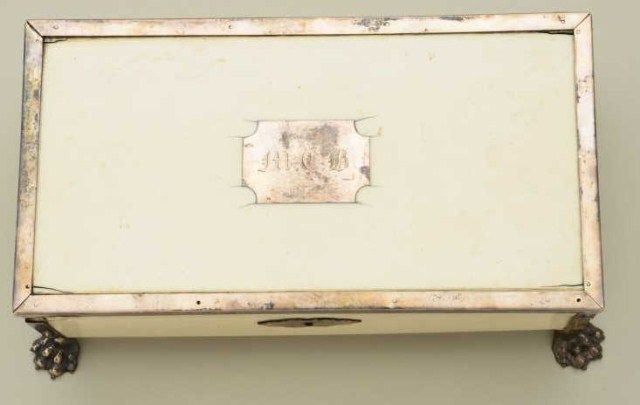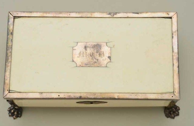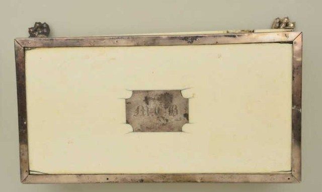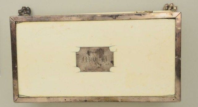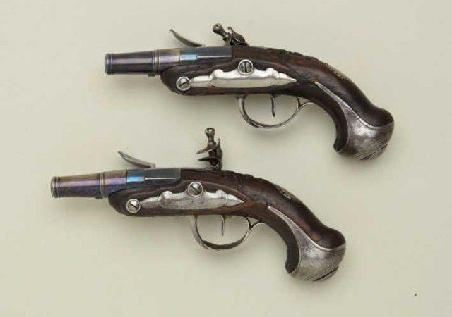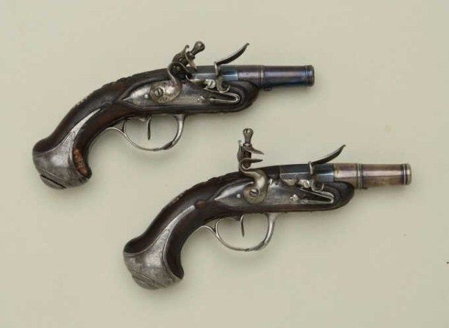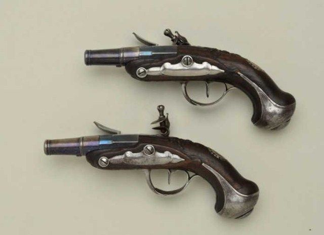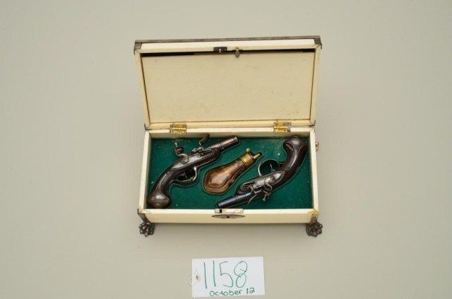 Cased pair of diminutive Flintlock pistols signed “Perronne Fils” and “a Avignon” (circa 1790-1810) in silver mounted bedroom vanity type case. The pair show iron mounts and are in very good condition with fire blued locksand barrels. The stocks are nicely carved with high relief roses around the tangs. The pair measure 6-1/2” overall and are approx 30 cal with screw type cannon barrels. The pair are contained within a felt lined French type case with lacquered flask of a later date. The top of the case shows a satin or silk type extender to contain writings or letters. The exterior of the case shows fancy silvered metal mounts with initials “M.C.B.” on top. The case measures approx 9-5/8” wide by 5” by 3-1/4” deep and is in good condition with some age cracks, small brakes around hinges but generally very good with fancy claw feet. The case is later than thepistols but is interesting, shows some age, and makes a great display set. Est.;$5,000-$10,000.