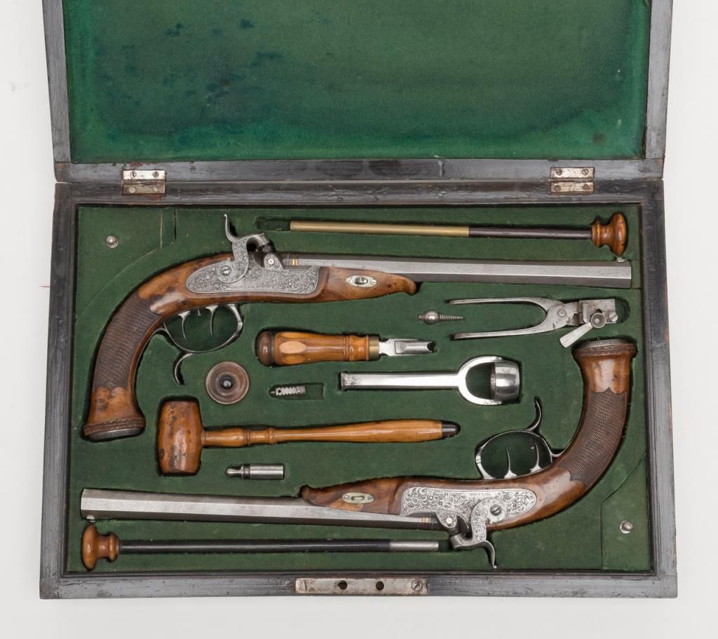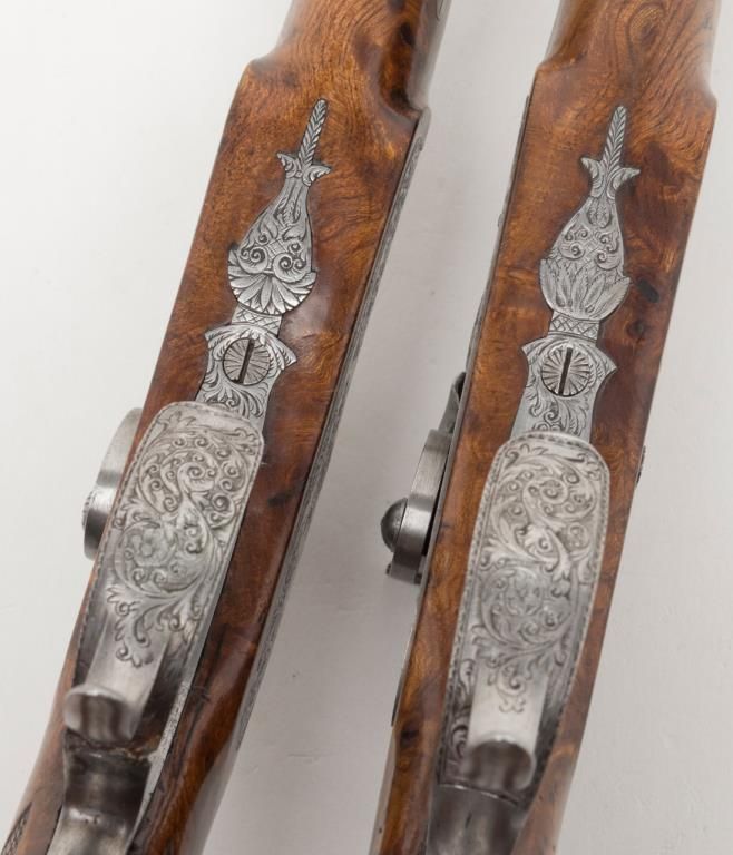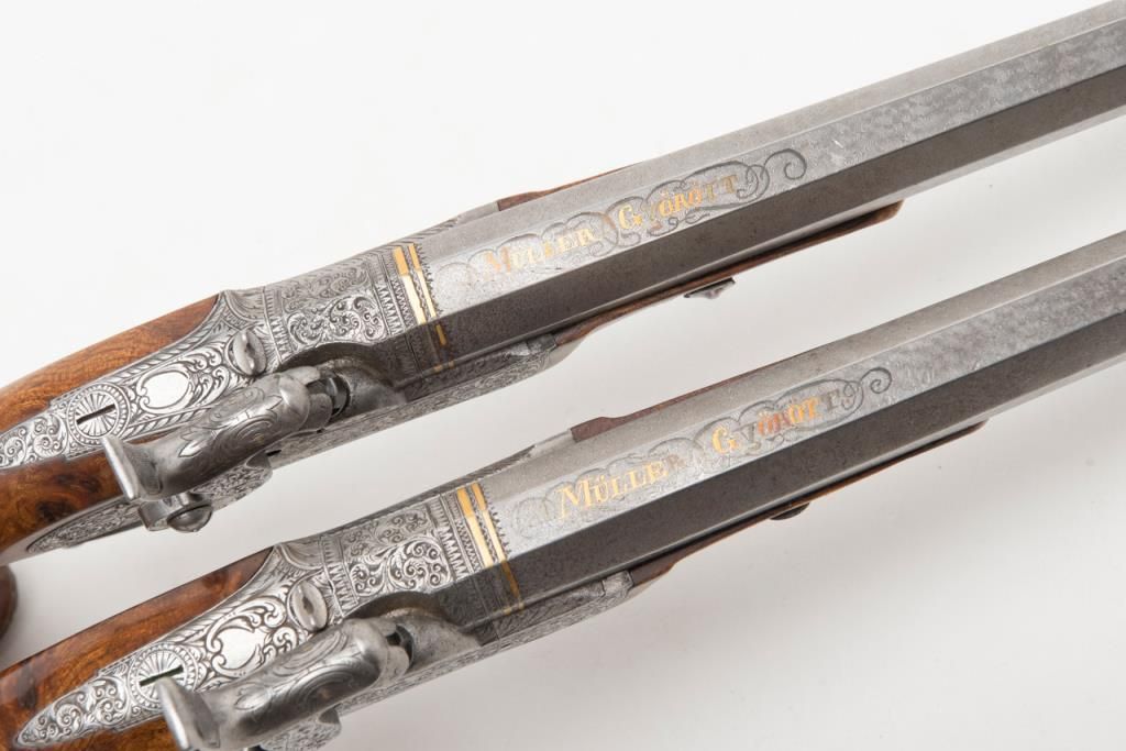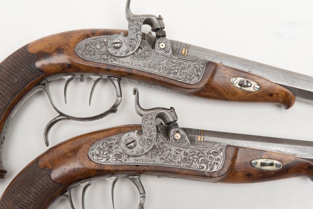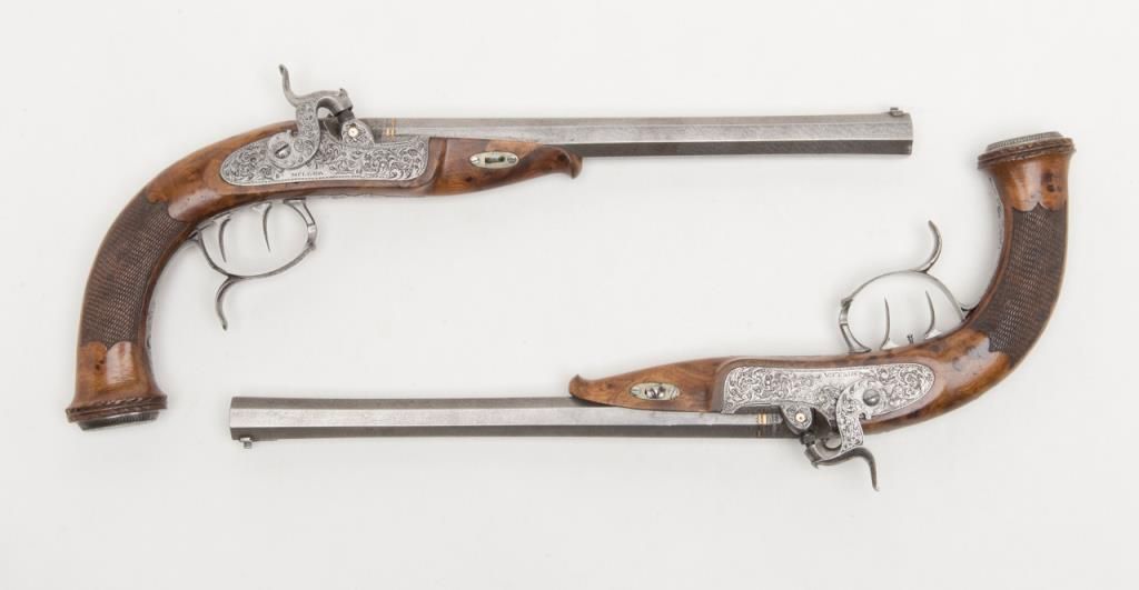 Cased pair of fine Muller Gyorott dueling/target pistols signed on the barrel and locks. The pair are half stocked and show double gold bands on the barrel with gold inlaid name surrounded in silver scrolls. The locks are nicely engraved as are the mounts and a fancy side plate also ornamented to match. Equipped with double set triggers. The pair are finished in the bright with Damascene barrels showing nicely flared muzzles. The stocks are a light-colored wood possibly fruit wood with a good grain and nice checkering with accent carving. The pair measure 16 ¾” overall with 10 ¾” barrels of approximately .48 caliber rifled. One pistol is not holding on full cock and the mate works well. The pistols are contained within a fitted stylecase lined in green felt which remains in very good condition with some normal fraying and aging. The case contains a proper mold, combination tool, rods, mallet, powder measure and rods with some extra pieces. The compartment covers to thecase are original. The exterior of the case is a veneered burl wood and show some light refinishing with cracks but is generally good. The condition of the pistols is very good plus with exceptionally clean metal surfaces. Est.: