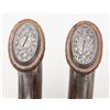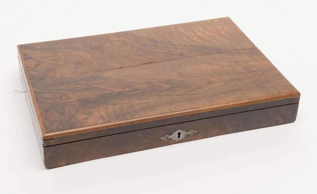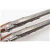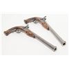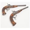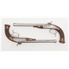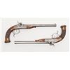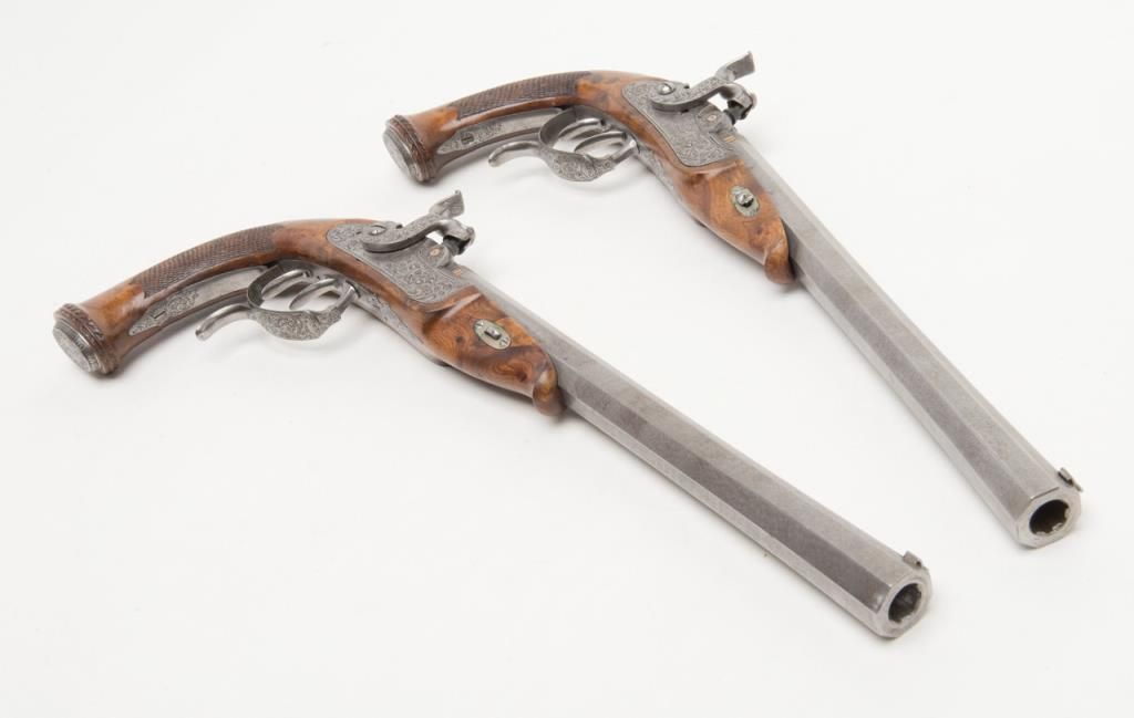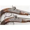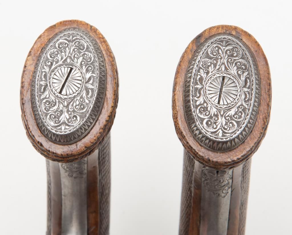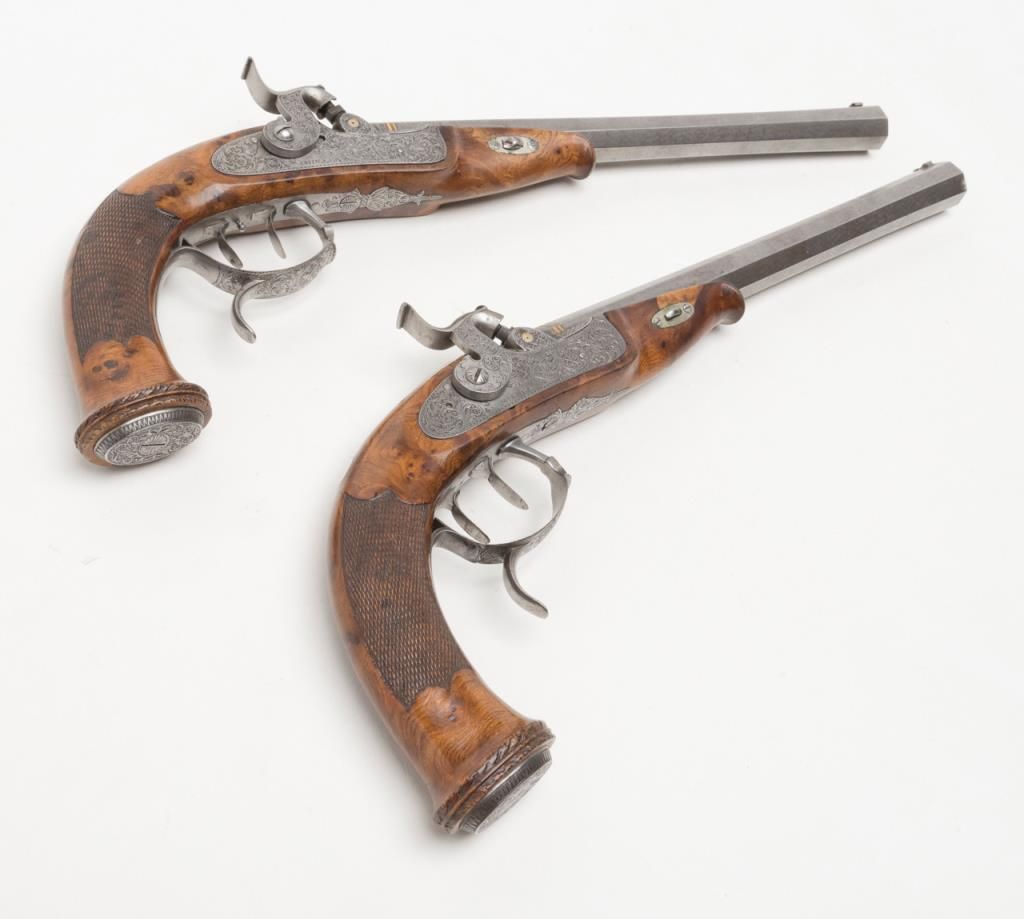 Cased pair of fine Muller Gyorott dueling/target pistols signed on the barrel and locks. The pair are half stocked and show double gold bands on the barrel with gold inlaid name surrounded in silver scrolls. The locks are nicely engraved as are the mounts and a fancy side plate also ornamented to match. Equipped with double set triggers. The pair are finished in the bright with Damascene barrels showing nicely flared muzzles. The stocks are a light-colored wood possibly fruit wood with a good grain and nice checkering with accent carving. The pair measure 16 ¾” overall with 10 ¾” barrels of approximately .48 caliber rifled. One pistol is not holding on full cock and the mate works well. The pistols are contained within a fitted stylecase lined in green felt which remains in very good condition with some normal fraying and aging. The case contains a proper mold, combination tool, rods, mallet, powder measure and rods with some extra pieces. The compartment covers to thecase are original. The exterior of the case is a veneered burl wood and show some light refinishing with cracks but is generally good. The condition of the pistols is very good plus with exceptionally clean metal surfaces. Est.:
