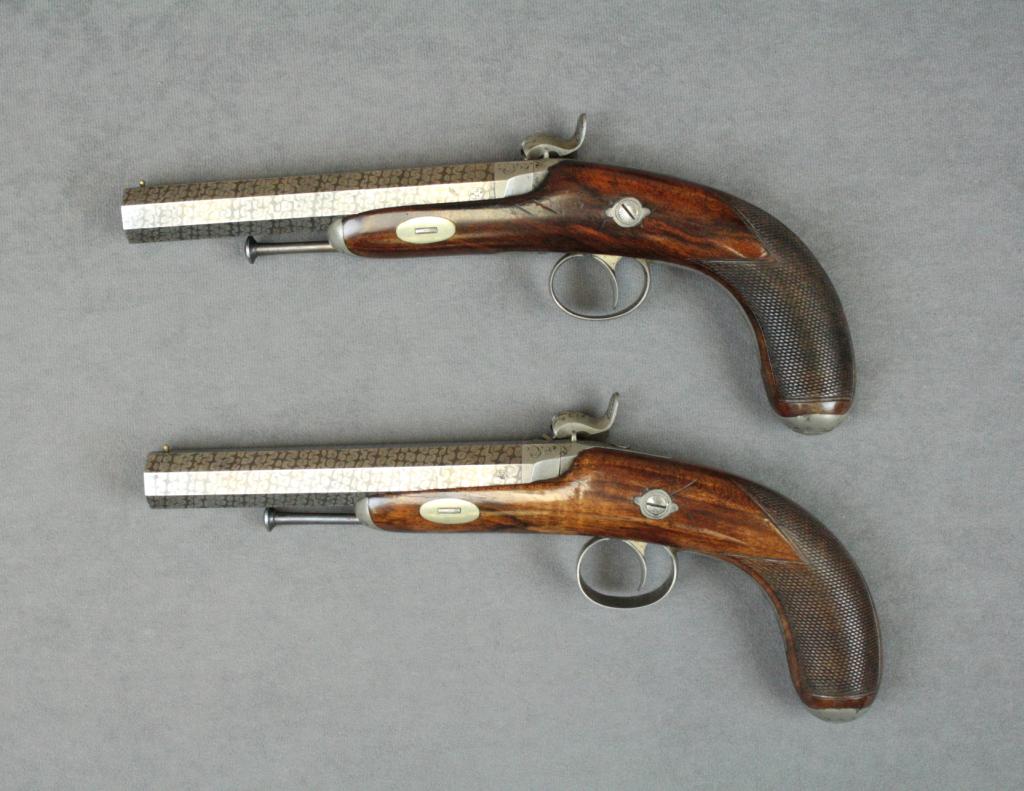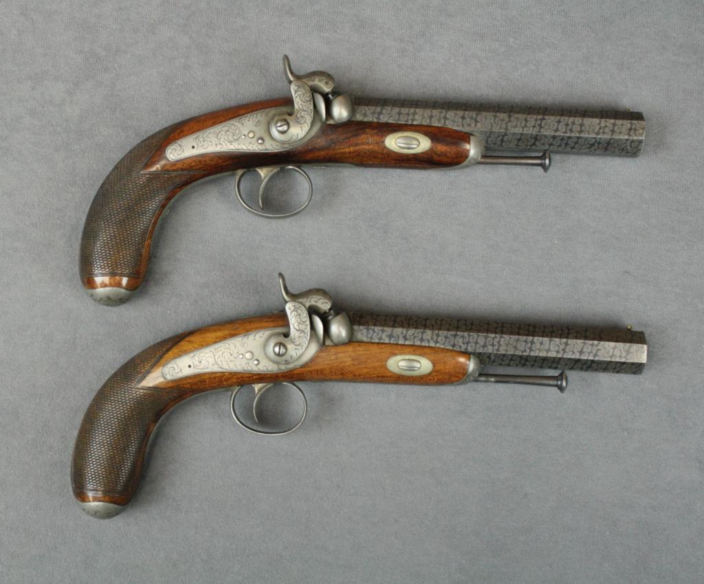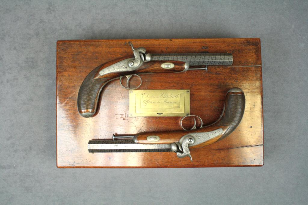 Cased pair of percussion European pistols, .65 cal., 6” octagon barrels with beautiful damascene design, engraved back action locks, engraved hammers and butt caps, checkered wood half stocks. These guns are in overallvery good condition showing the majority of their damascene design on barrels, crisp actions, fine bores, fine stocks, iron ramrods. The presentation wood case is in overall very good condition with a brassrecessed handle in the lid with engraved “V. Amedee de Chastenet, Officer de Marine”; there are scattered light scratches on the lid and an old separation of graining from age at the lower right hand corner; theinterior is lined in green baize and come with an iron bullet mold, wood handled screwdriver and small brass bag style flask; also included is a key to the lock of the case. Est.: $800-$1,600.