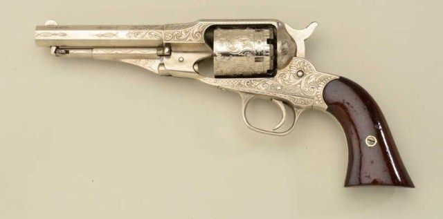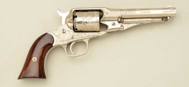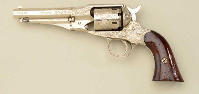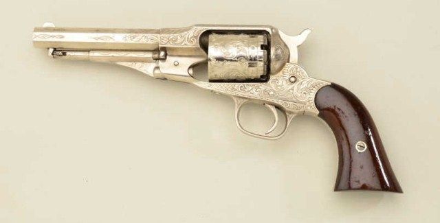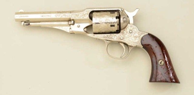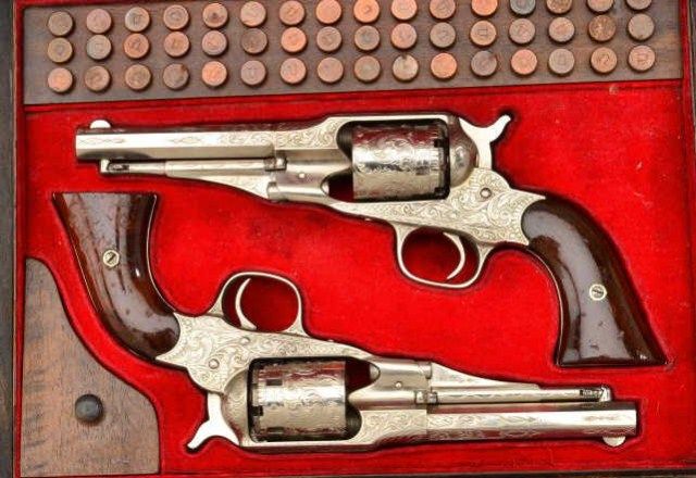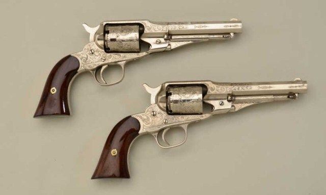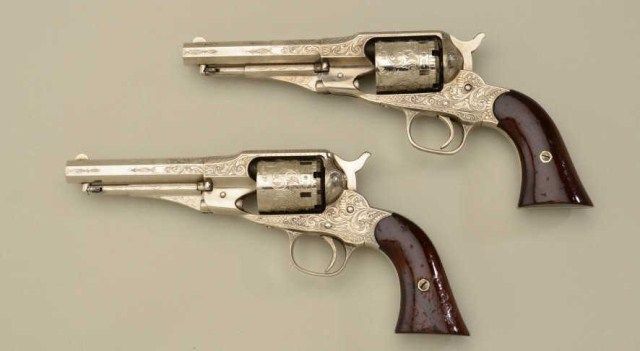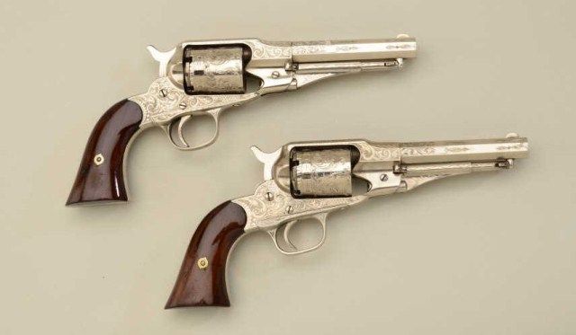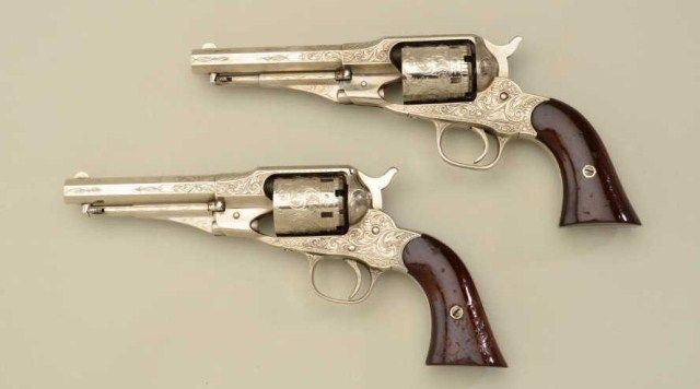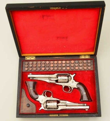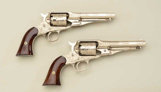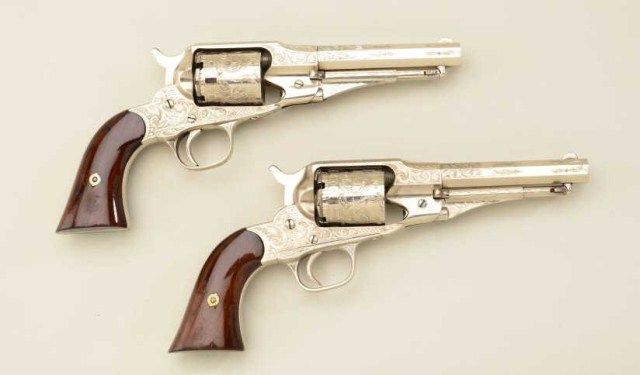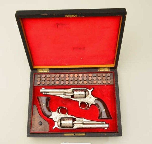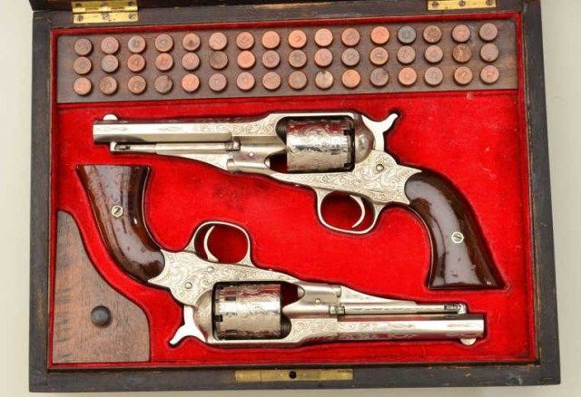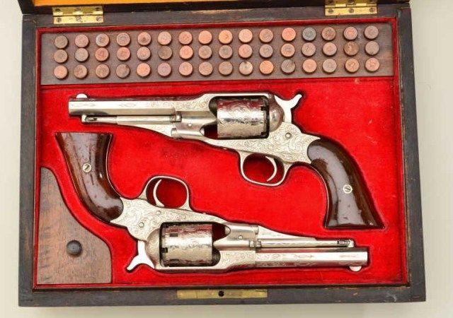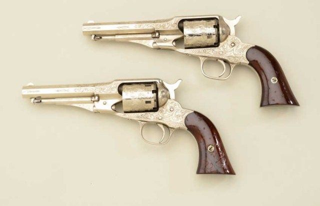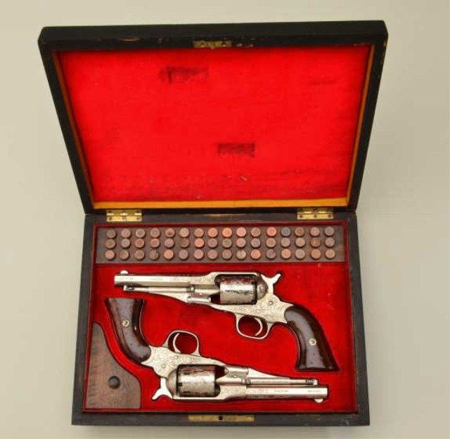 Cased pair of period factory style engraved Remington New Model Police cartridge conversion revolvers, .36 cal., 4-1/2” octagon barrels, nickel finishes, deluxe rosewood grips, #15652 and #15782. These guns are matching in engraving and in condition showing approx. 99% original finish on both guns, fine bores, crisp actions and markings, rosewood grips on #15652 are fine with some scattered old mars to the finish; the leftgrip of #15782 shows more pronounced mars and scratches to the finish of the left grip; casing is original and deluxe with brass escutcheon plaque and brass border lining on top of lid; some damage to veneer on leftside of casing base; interior red baize is overall good, guns are in French style forms with wood block for 48 cartridges (included with this lot) and a covered compartment for the key to the case’s lock that works withthis key. A beautiful pair of New Model Police revolvers in a deluxe casing. Est.: $6,000-$12,000.