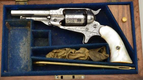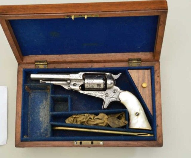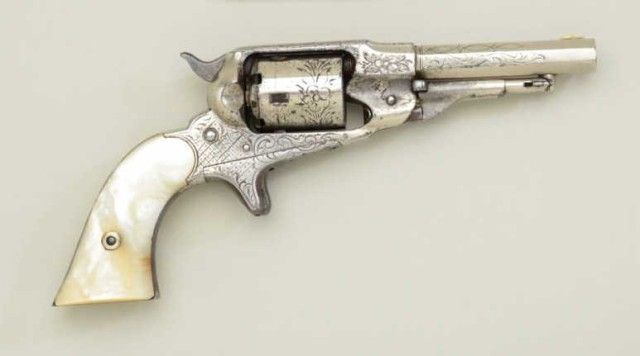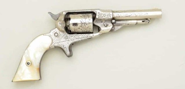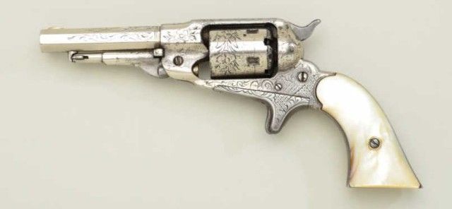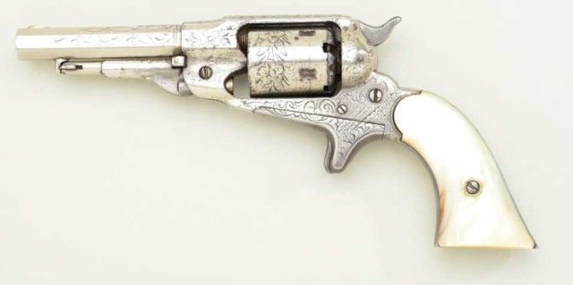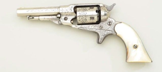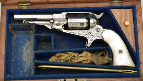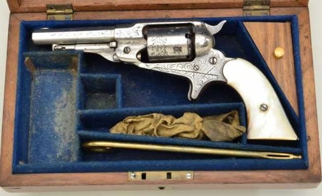 Cased scroll and floral period engraved Remington New Model Pocket conversion revolver, .32 cal., 3-1/2” octagon barrel, nickel finish, pearl grips, #21197. This gun is in overall very good + condition showingapprox. 35% nickel finish with balance gone to a pleasing grey patina, good action, bore and barrel address; grips are overall very good with iridescent coloring and fit this gun beautifully; the deluxe case is overallvery good condition with fine graining on top of the lid with circular plaque; blue baize lining, brass cleaning rod and covered corner compartment that holds the key that works this case’s lock. Est.: $1,200-$1,800.