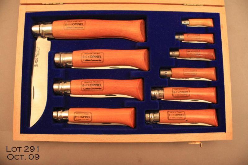 Cased set of 10 OPINEL French folding knives in 10 different sizes ranging from 2” to 6.5” blades. Knives are new and in a presentation wooden case with blue velvet lining. Est. $100-$300.