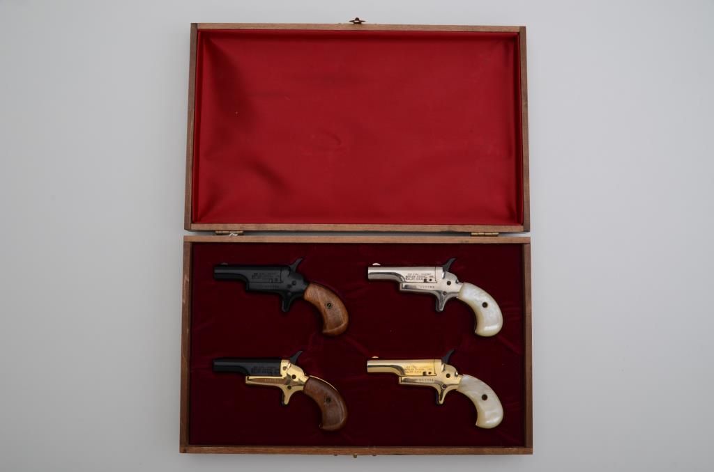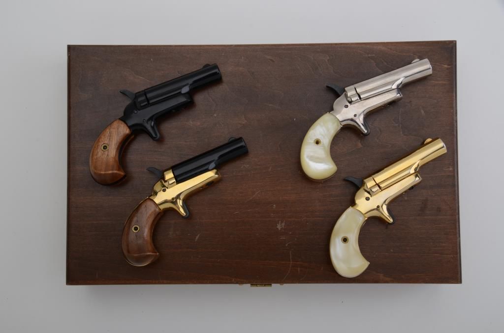 Cased set of 4 modern Butler single shot derringers, all .22 short cal., all 2-1/2” barrels and including #B59393, nickel finish with faux pearl grips in overall very good condition; B59392, blue finish with woodgrips in overall very good condition; #B59395, gold finish with faux pearl grips in overall very good to fine condition and #B59394, bold and blue finish with wood grips in overall very good + condition; a niceconsecutive set in a lined wood box that is overall good in condition with scattered mars and light scratches from storage. Est.: $500-$1,000.