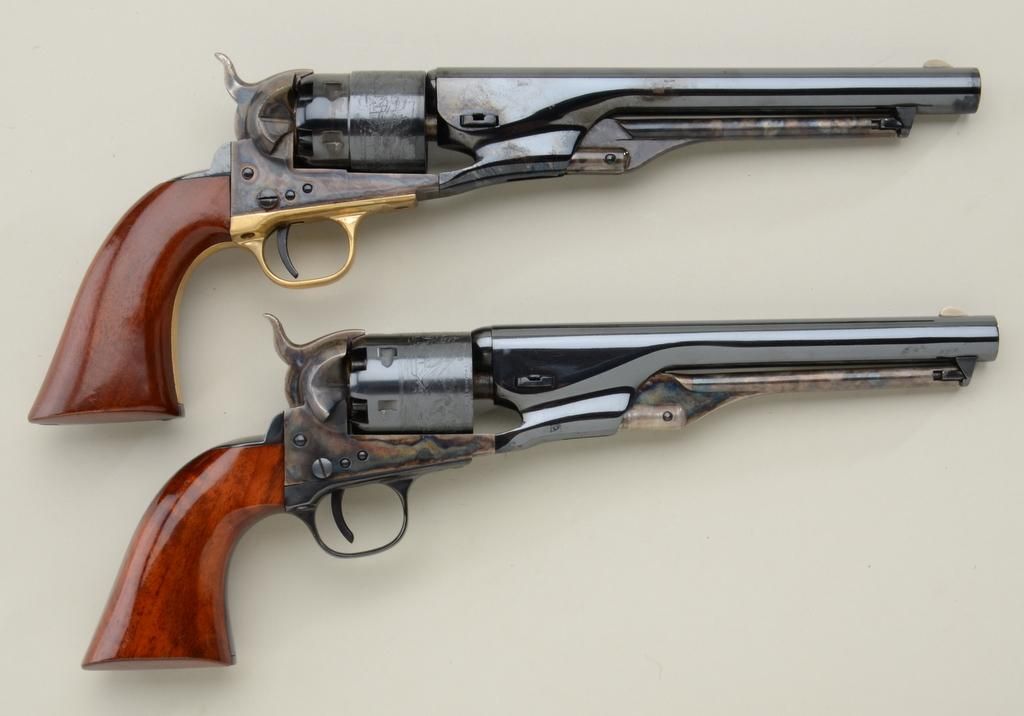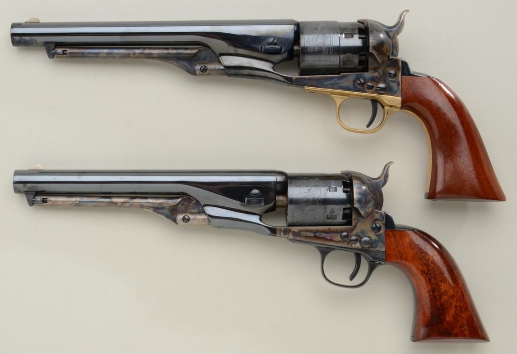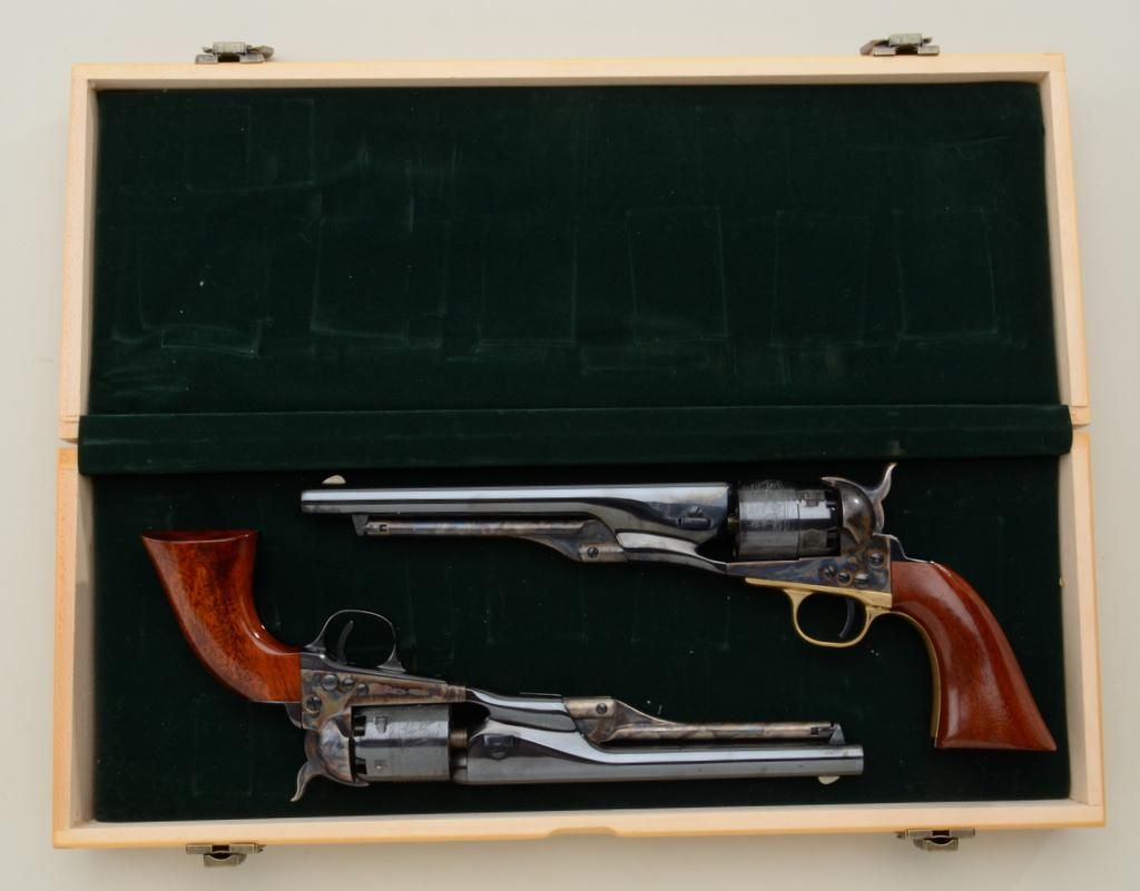 Cased set of Modern Colt Blackpowder Series percussion revolvers including a Model 1860 Army (#223696) and a Model 1861 Navy (#45823), both blued and case hardened with beautiful wood grips and both in like newcondition showing little handling; contained in a custom blonde wood case. Est.: $900-$1,800.